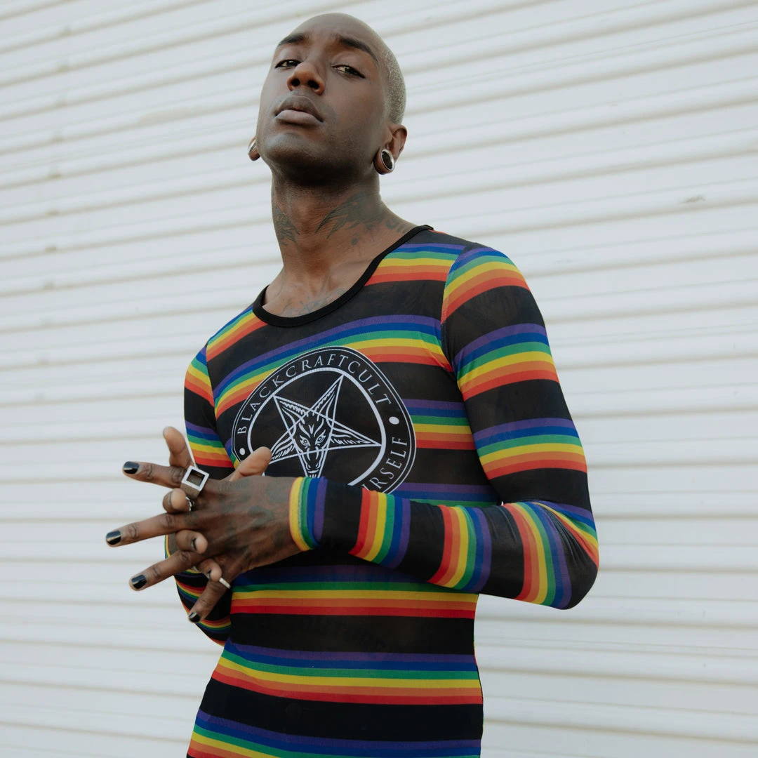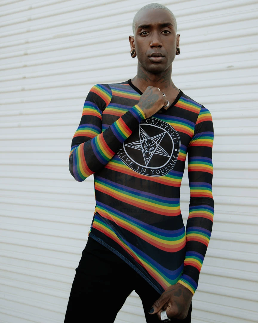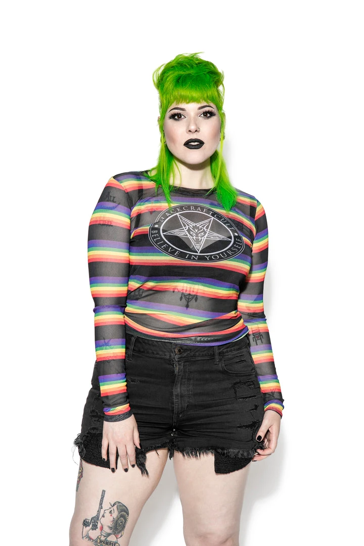 Proud to be allies every day of every month! This rainbow mesh long sleeve features our Believe in Yourself logo across the chest. Form fitting, see-through top.