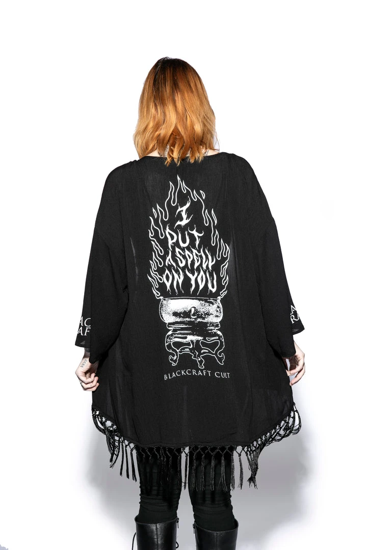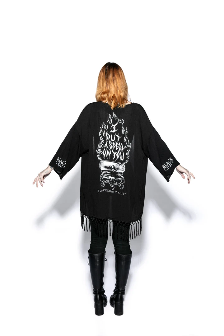 Women’s Oversized kimono with crochet fringe detail at bottom.