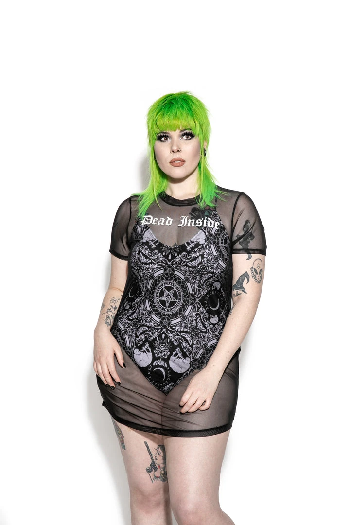 This form fitting all mesh T-shirt dress is a staple for the summer. Can wear over a bathing suit or a cheeky outfit! Features our “Dead Inside” print along the chest.