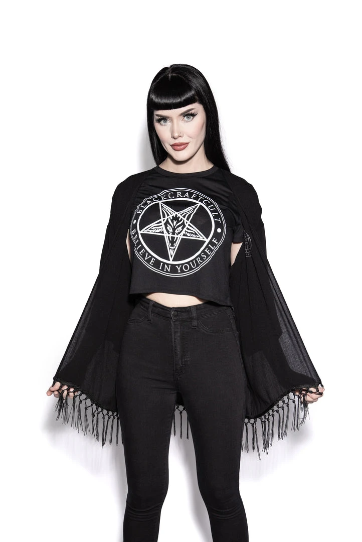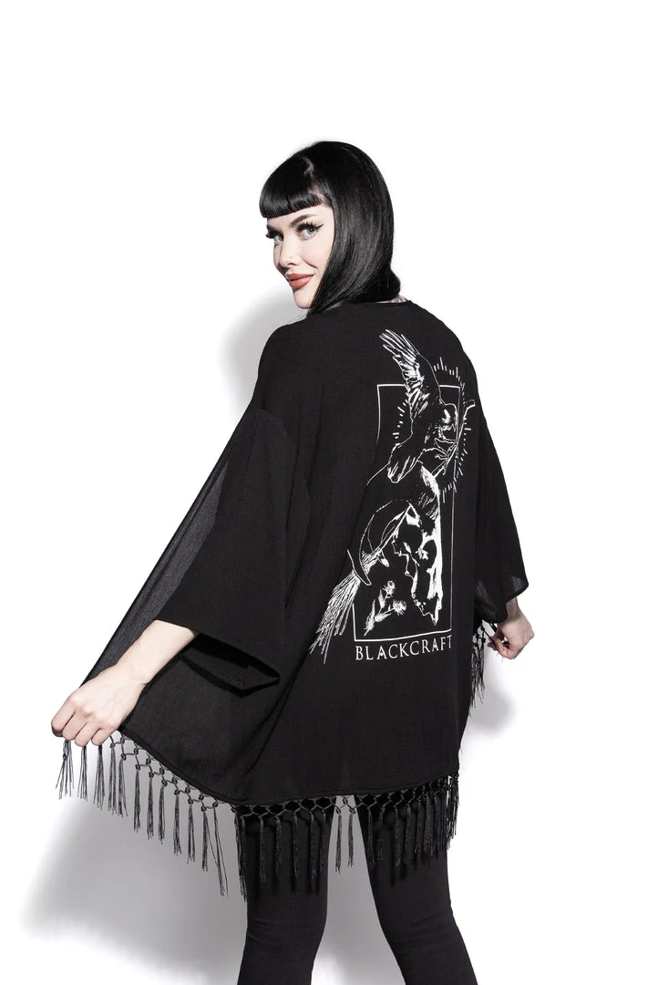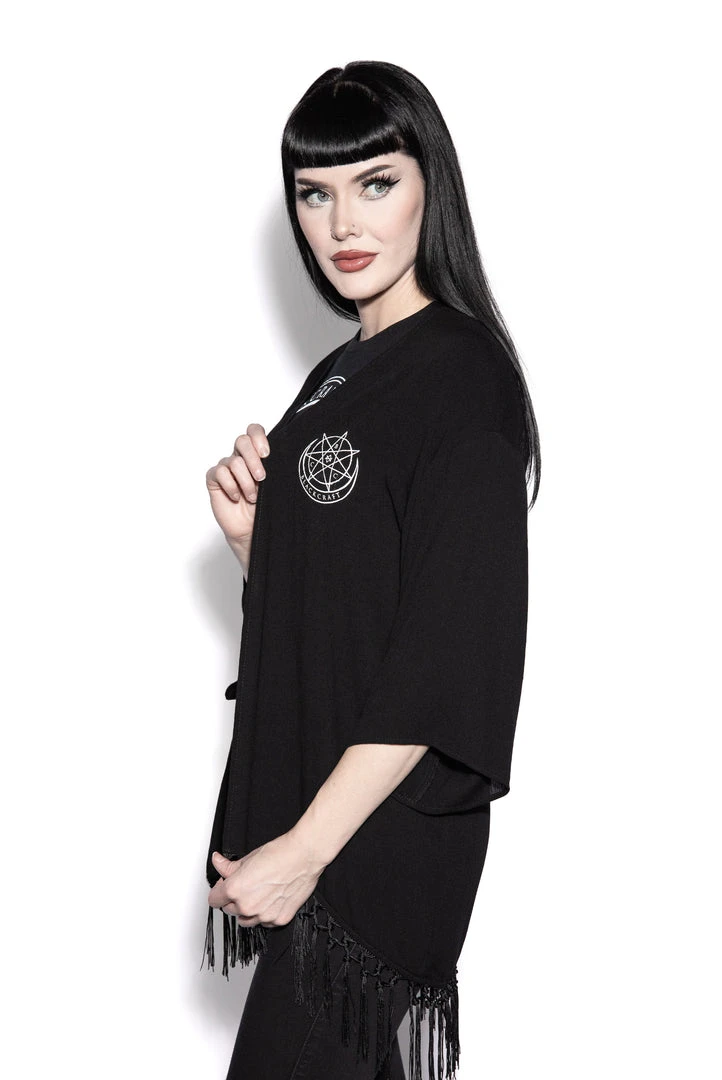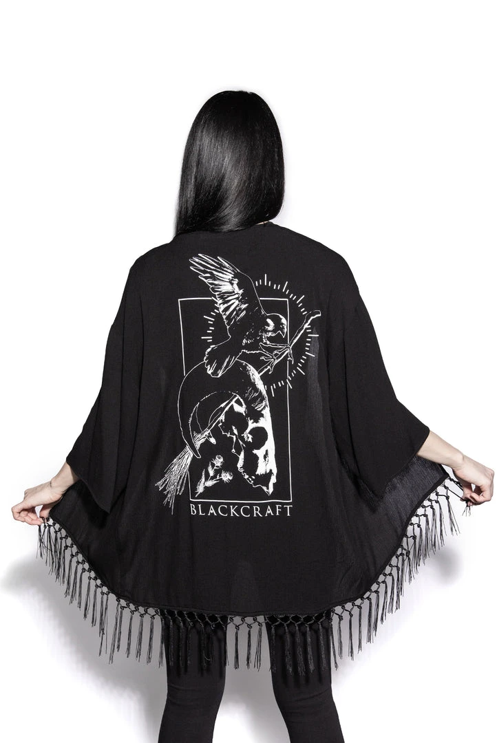 Women’s Oversized kimono with crochet fringe detail at bottom.