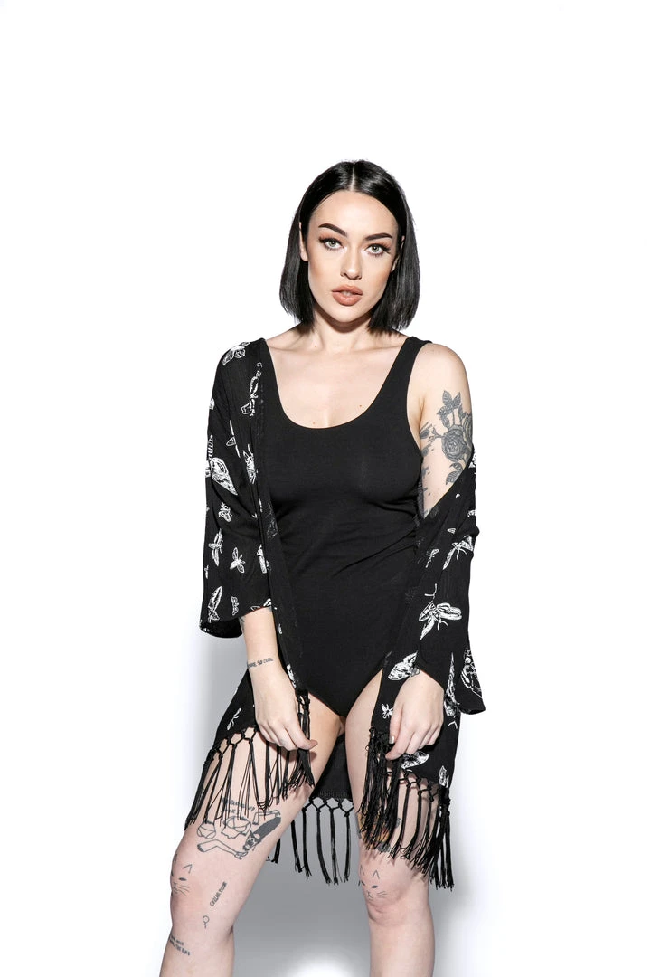 Women’s Oversized kimono with crochet fringe detail at bottom.