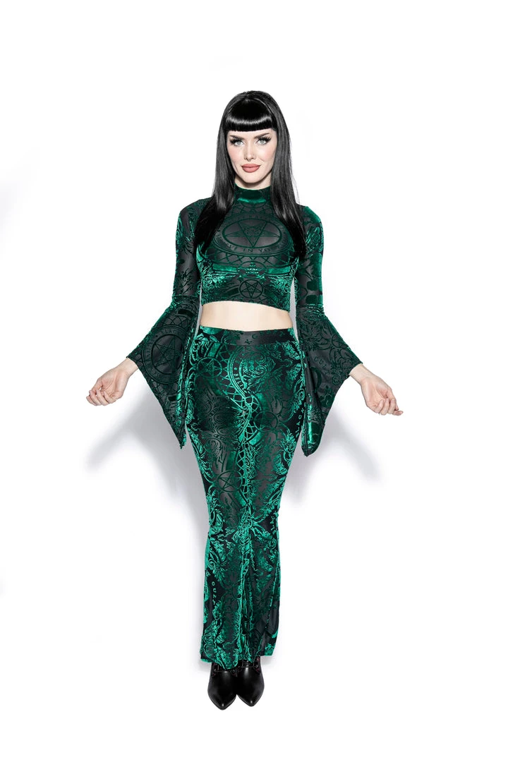 Part of the green velvet collection, the pant comes in a luxurious green baroque style with a high waist. It features a fitted leg with a flared bottom, fitted waist, and black shorts sewn in (because pants are somewhat see-through). It is soft to the touch with a slight stretch.Â