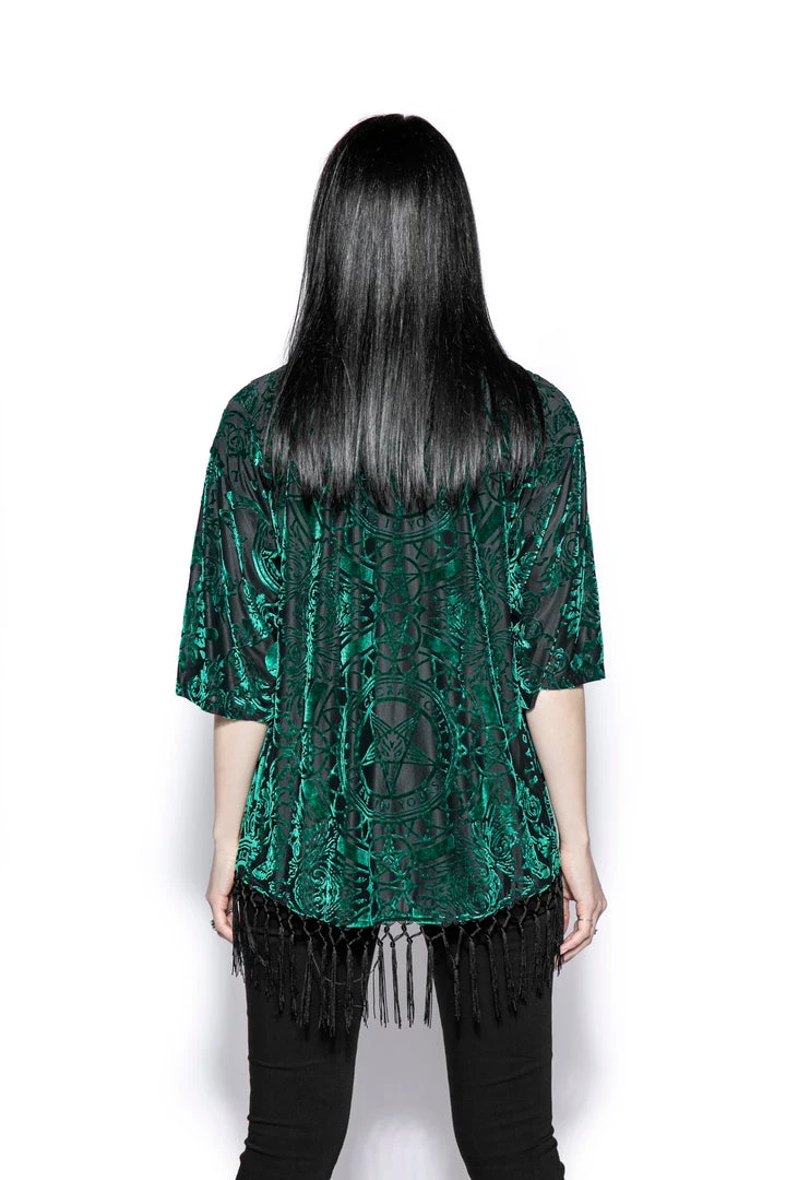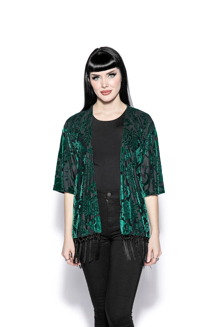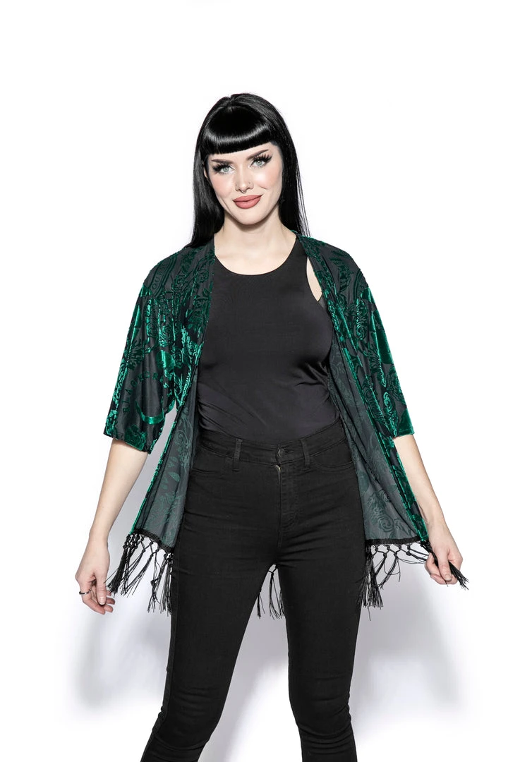 Part of the green velvet collection, the kimono comes in a luxurious green baroque style with fringe details. It features a typical oversized kimono fit and open front. It is soft to the touch with a slight stretch.Â