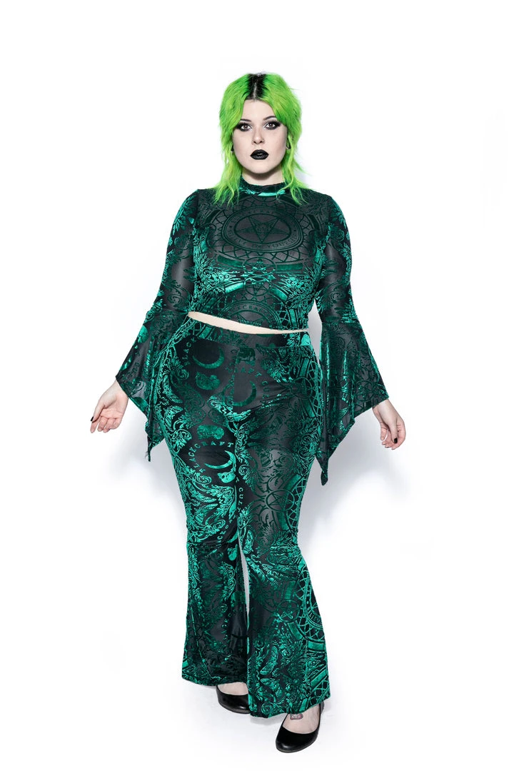 Part of the green velvet collection, the top comes in a luxurious green baroque style and form-fitting long sleeve. It features a mock neck, cropped top, and see-through design . It is soft to the touch with a slight stretch.Â