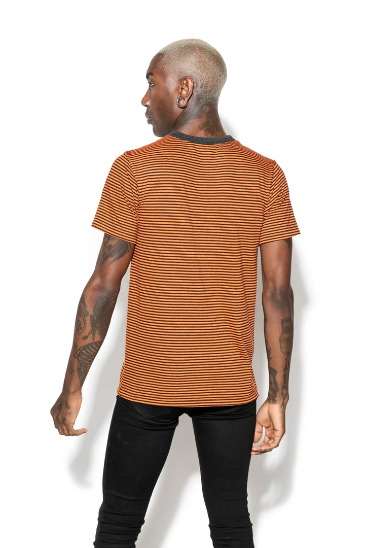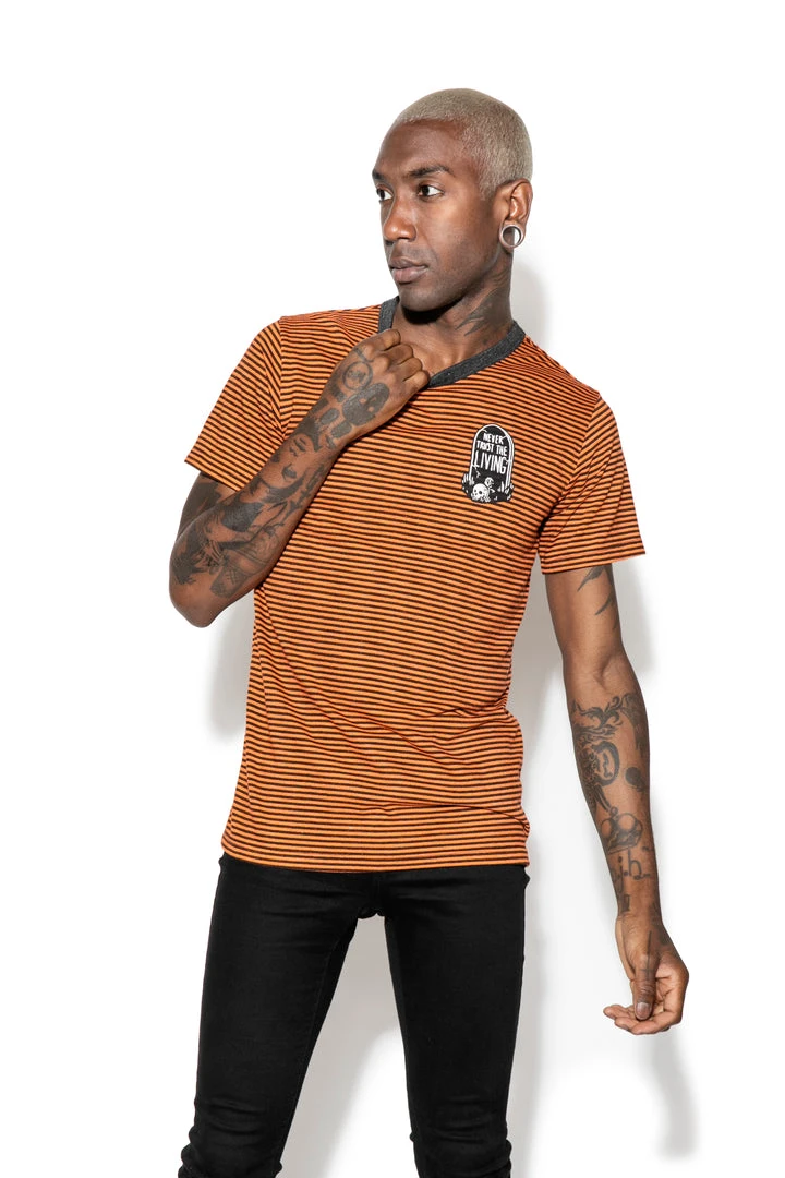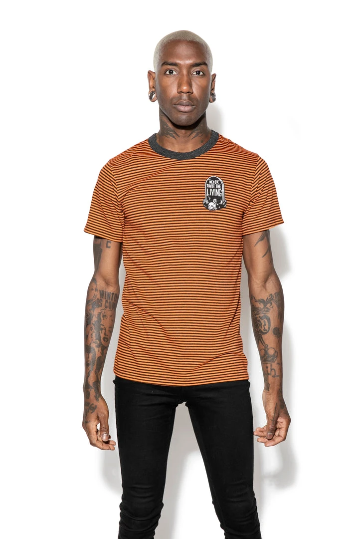 Unisex orange striped tee with Never Trust the Living print on the left chest.