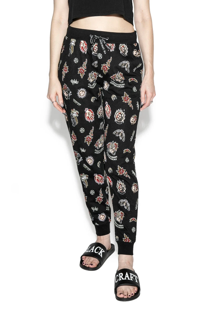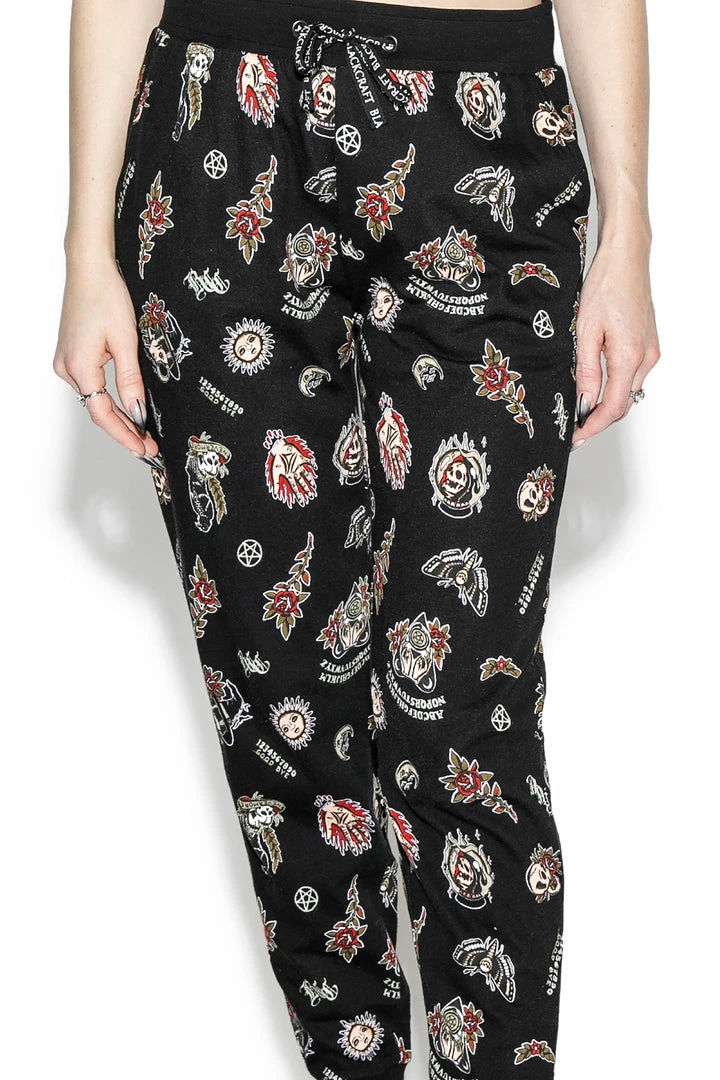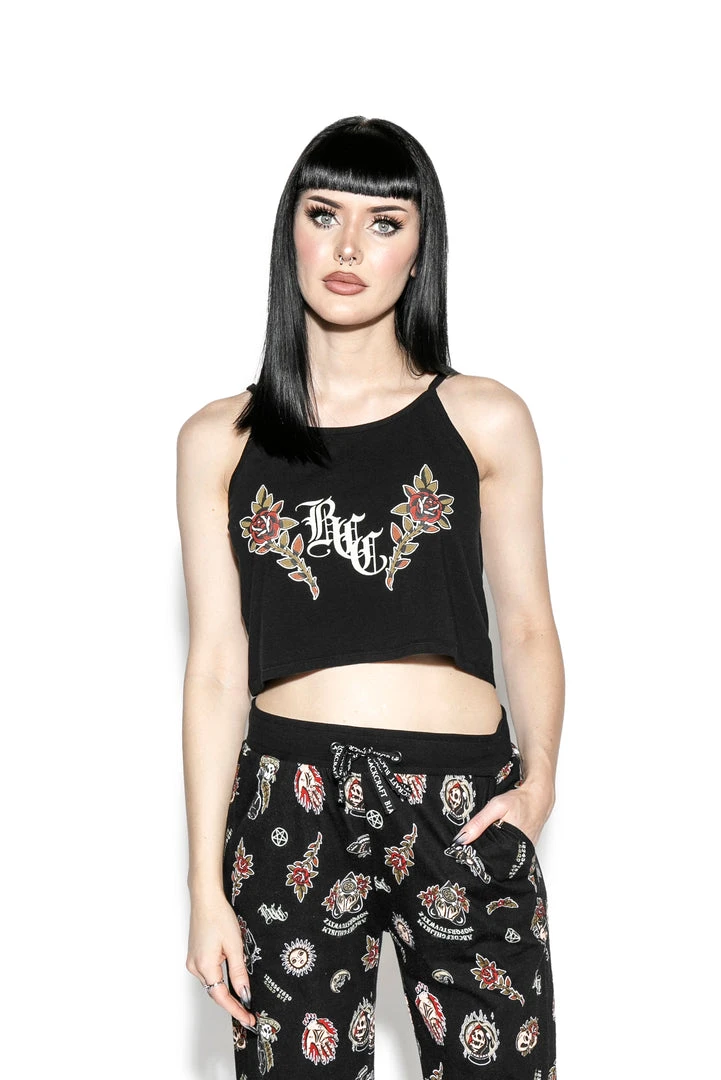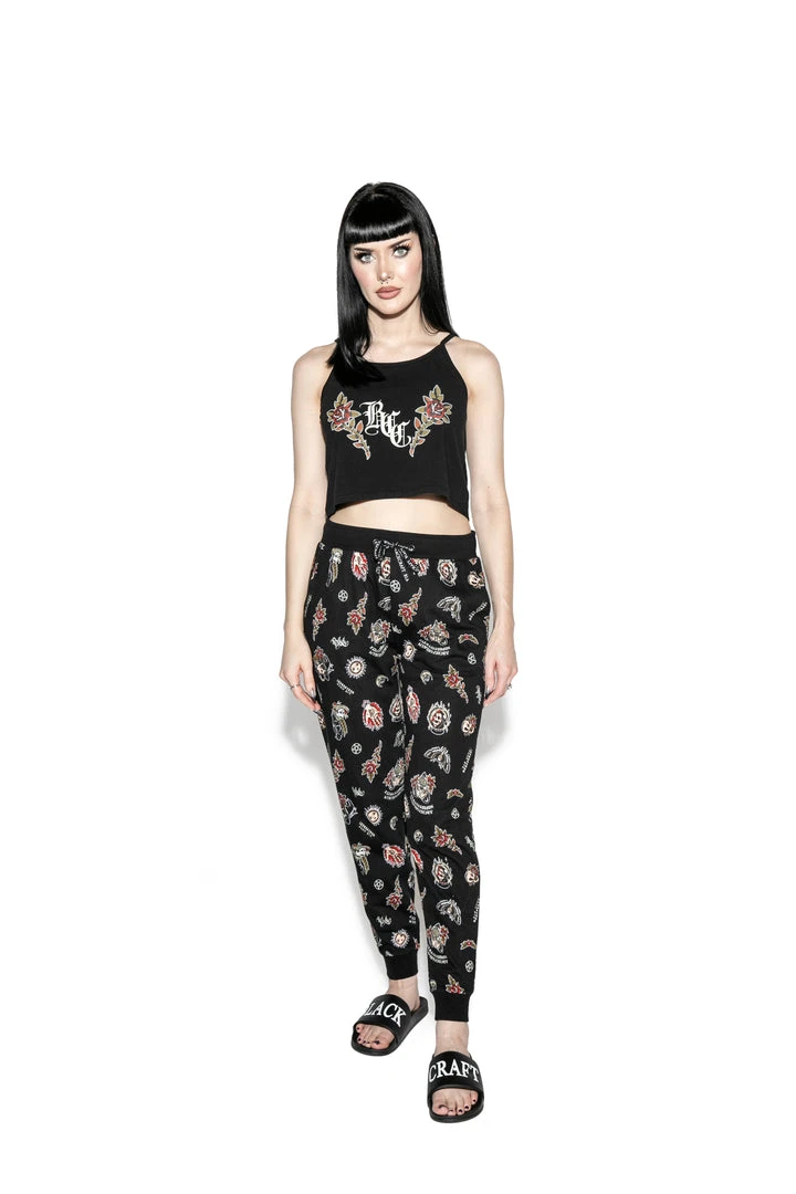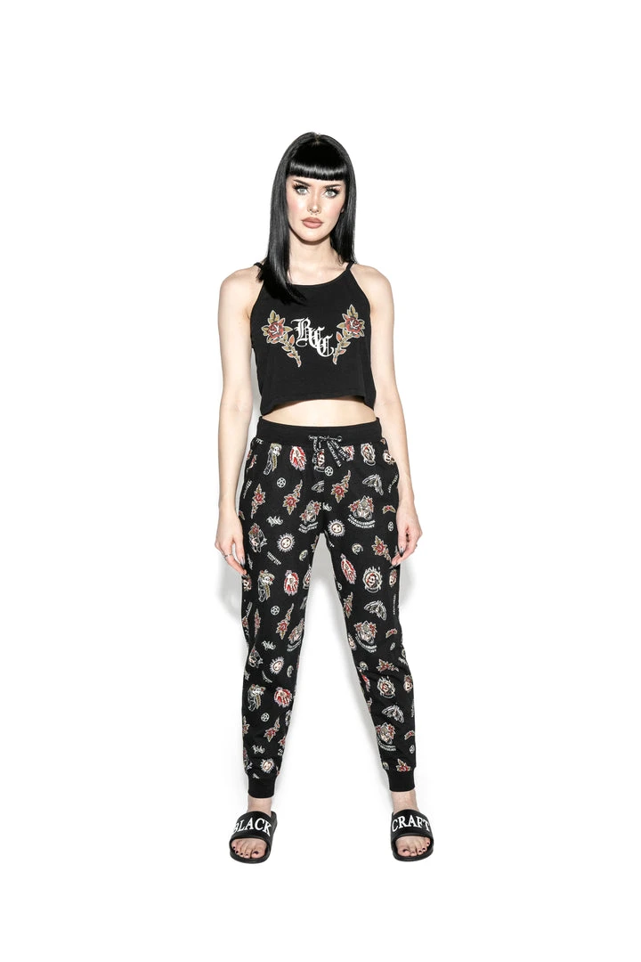 Two-piece jogger pajama set with all Ouija Flash design and BCC logo. Mid-length tank top with jogger pajamas.