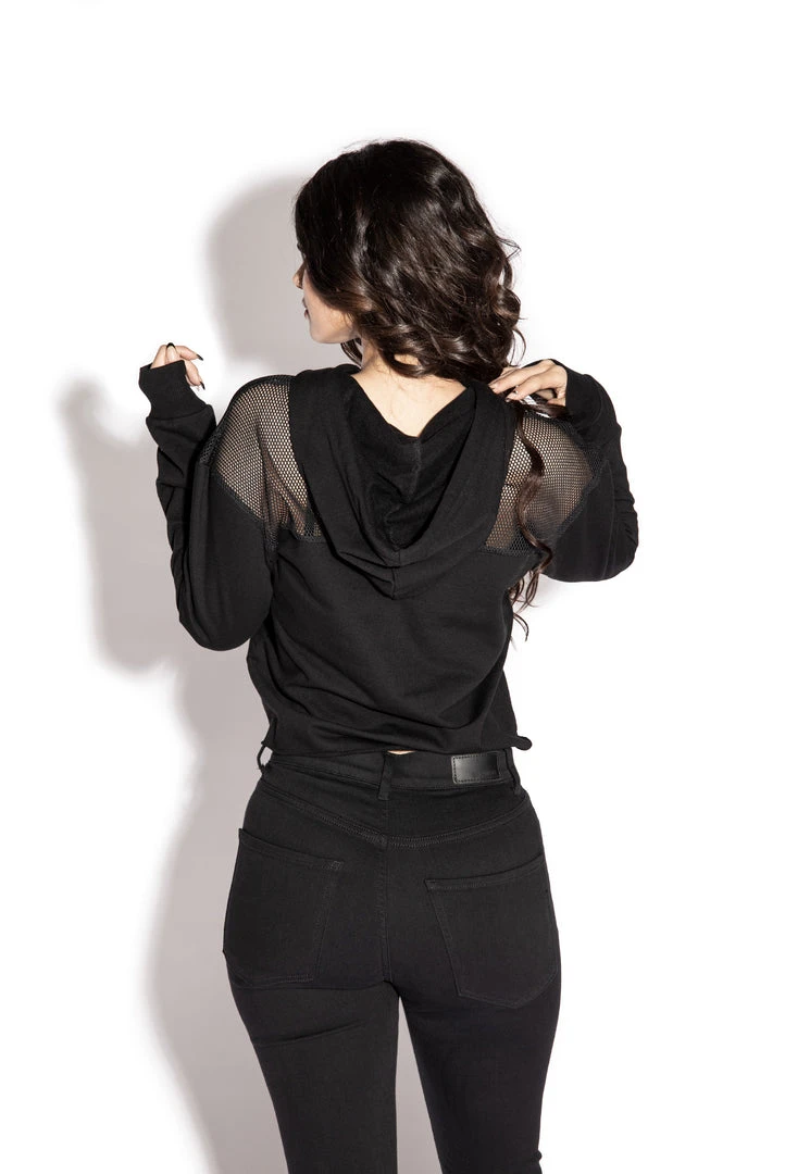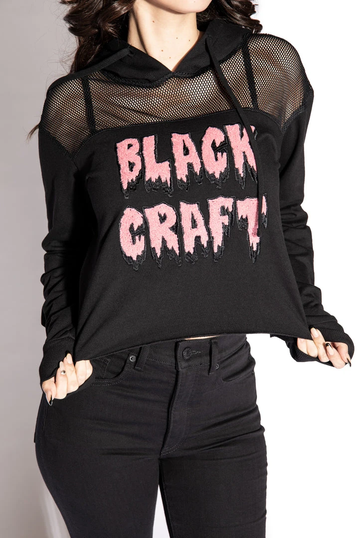 Mesh crop hoodie with Blackcraft Slime staple logo in pink.