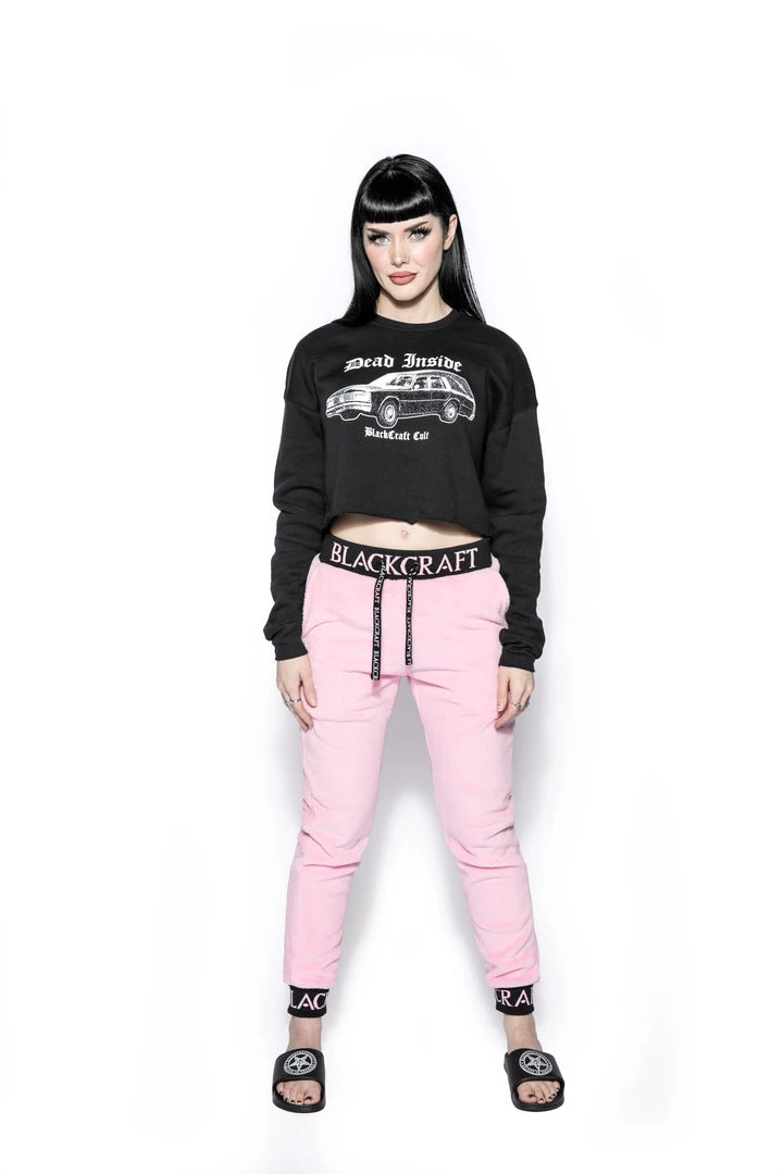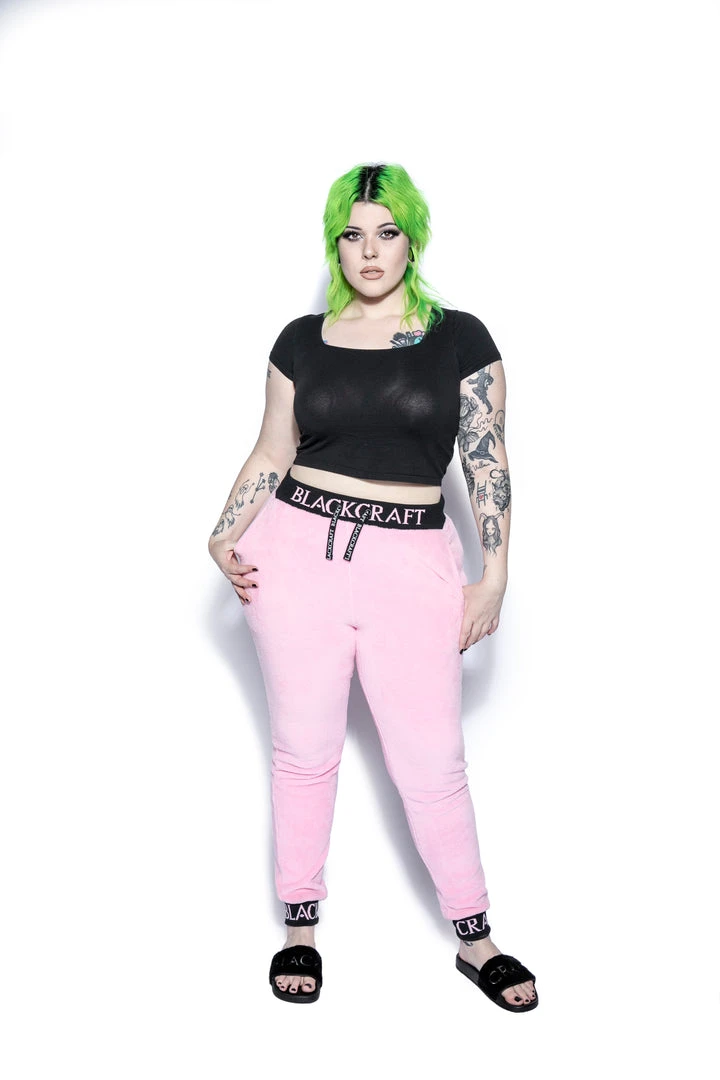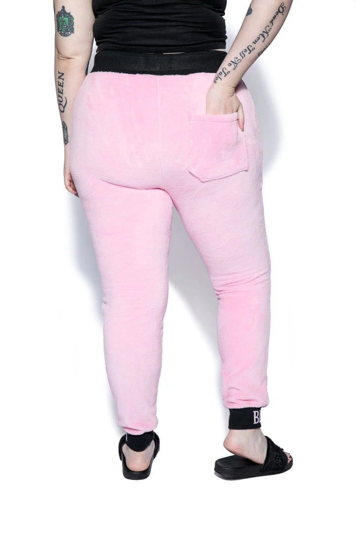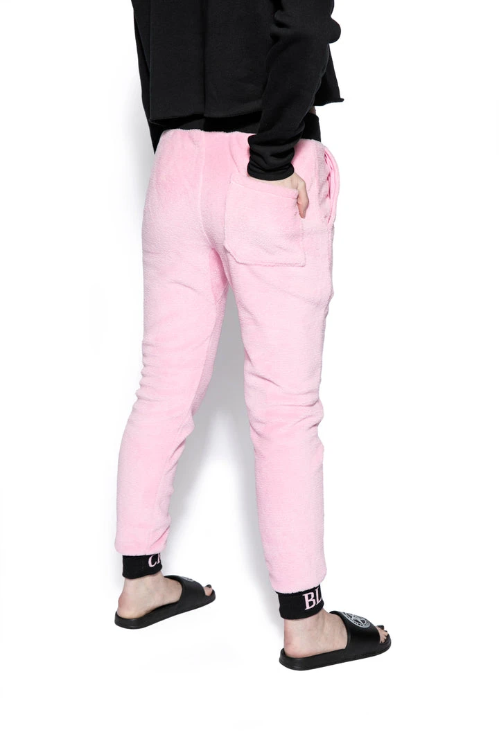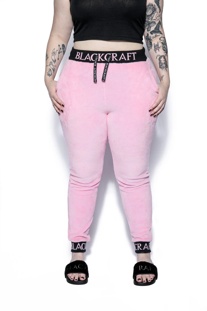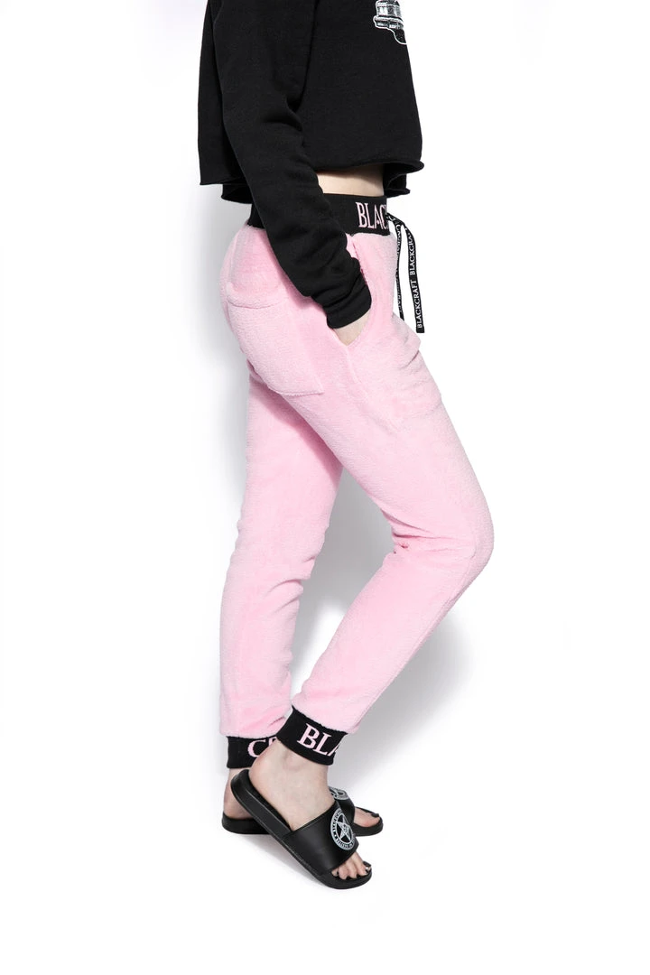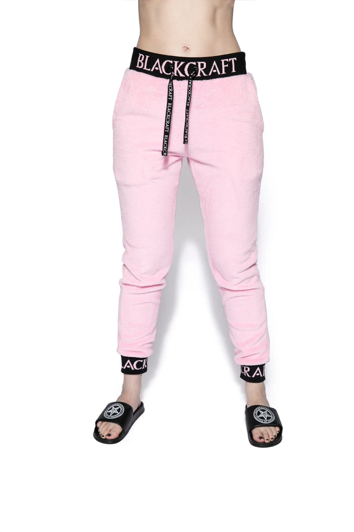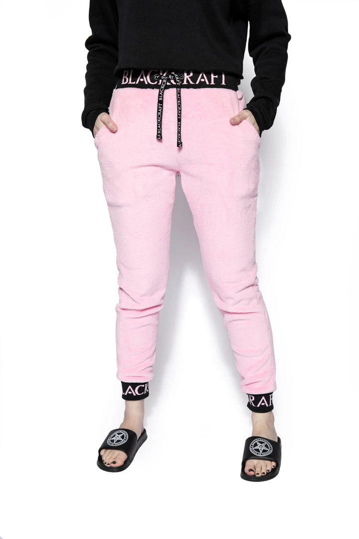 Cozy pink sherpa joggers with Blackcraft logo waistband, drawstrings, and ankle cuffs.
