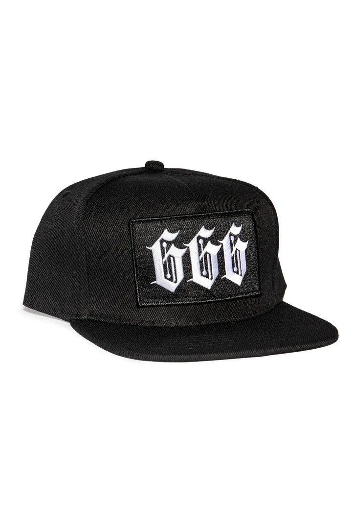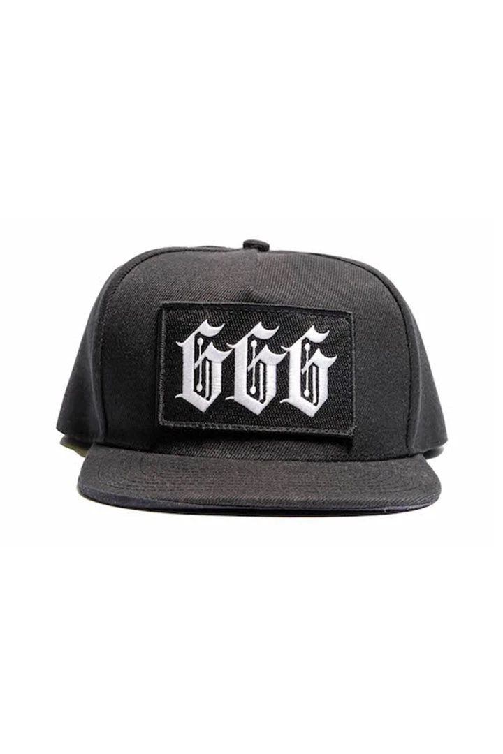 Embroidered “666” patch on front.