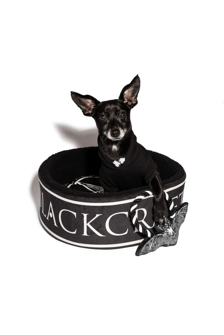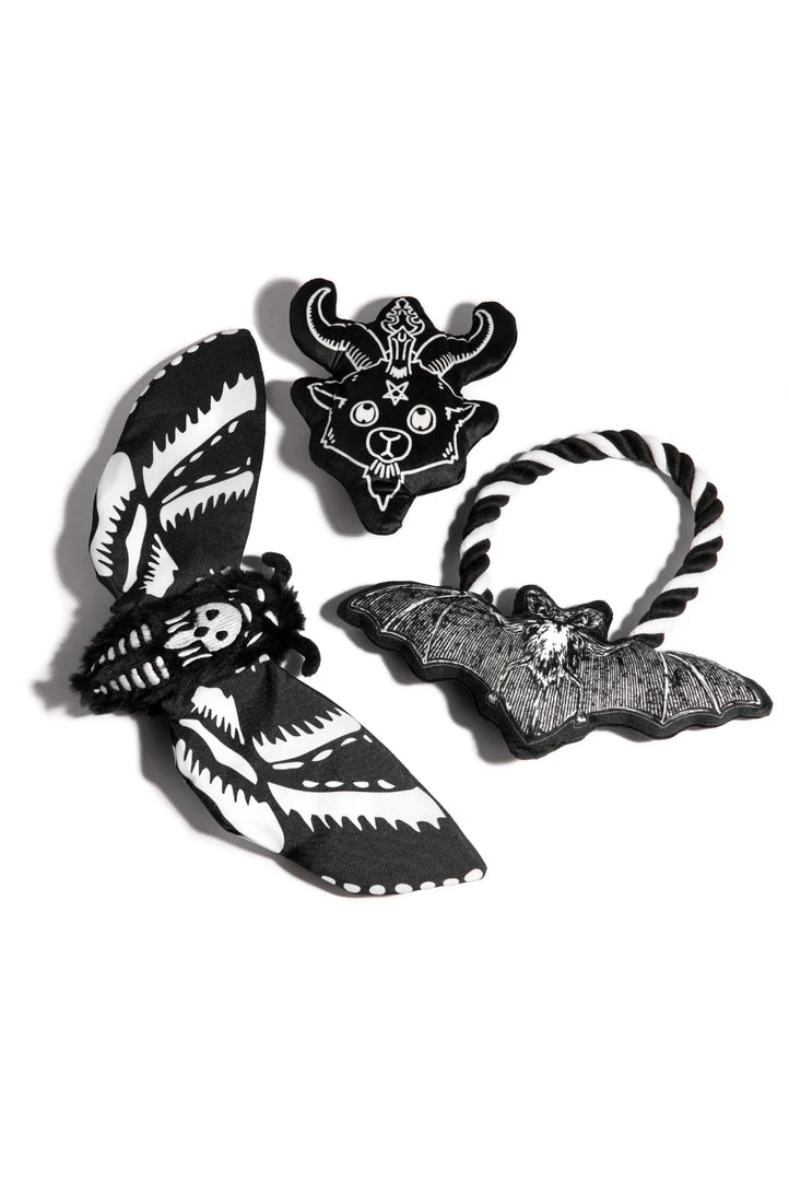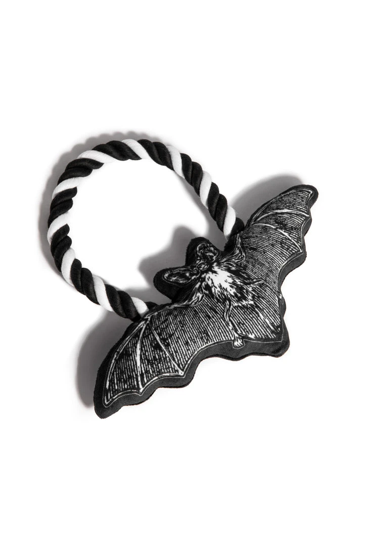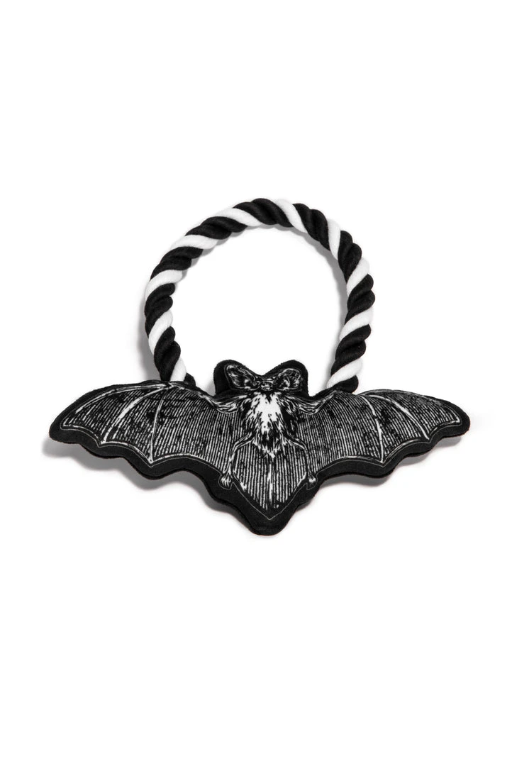Plush batcraft pet toy features black and white striped durable rope. Plush toy includes squeaker inside for more fun!