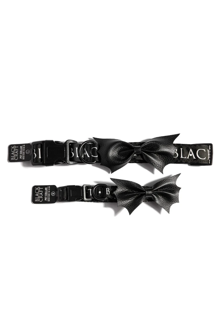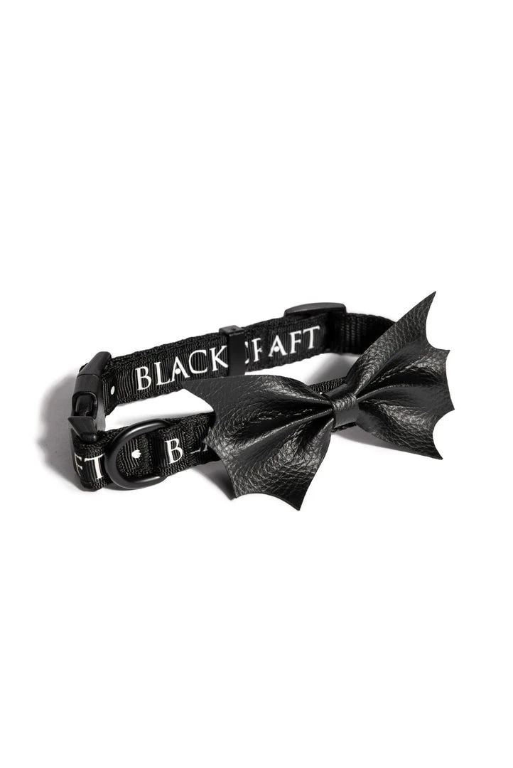 Blackcraft logo dog collar with adjustable straps and buckle clip closure. Includes textured bat wing bow and D-ring for leash clip.