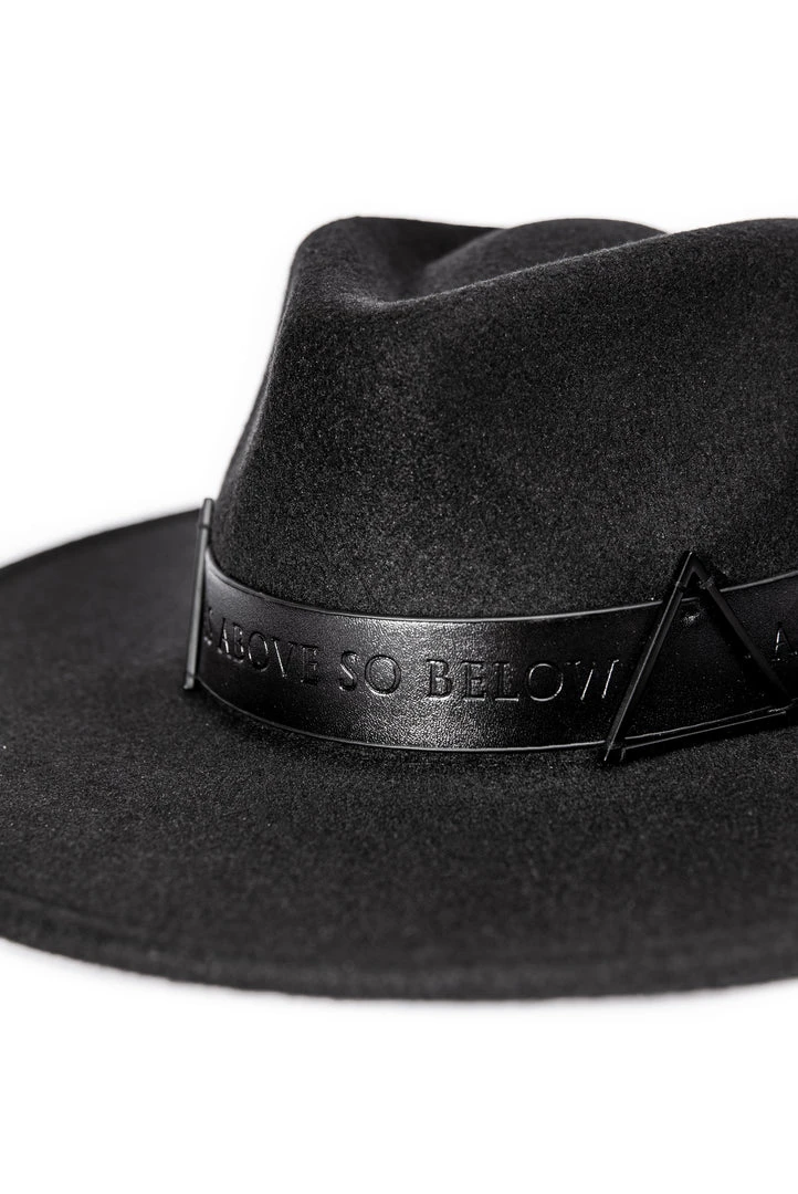 Black wide-brimmed hat with fedora crown shape. Faux leather band with “As Above So Below” debossed around the band. Features three matte black triangle hardwares.