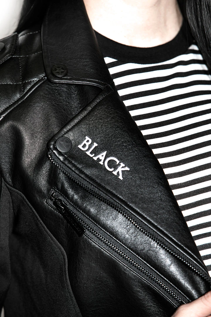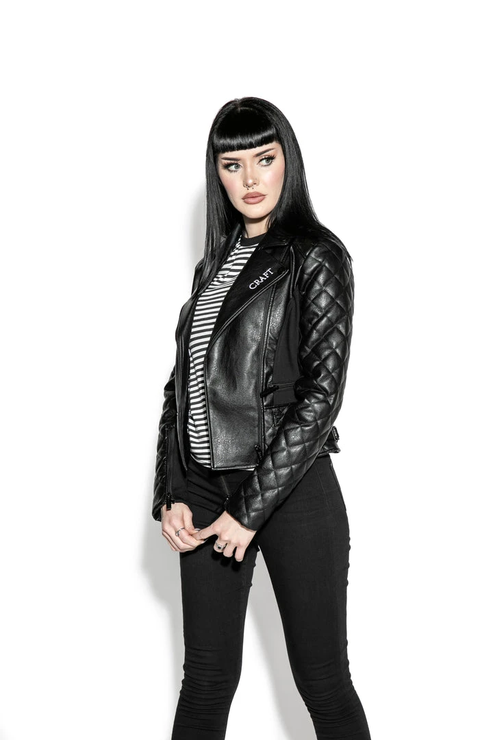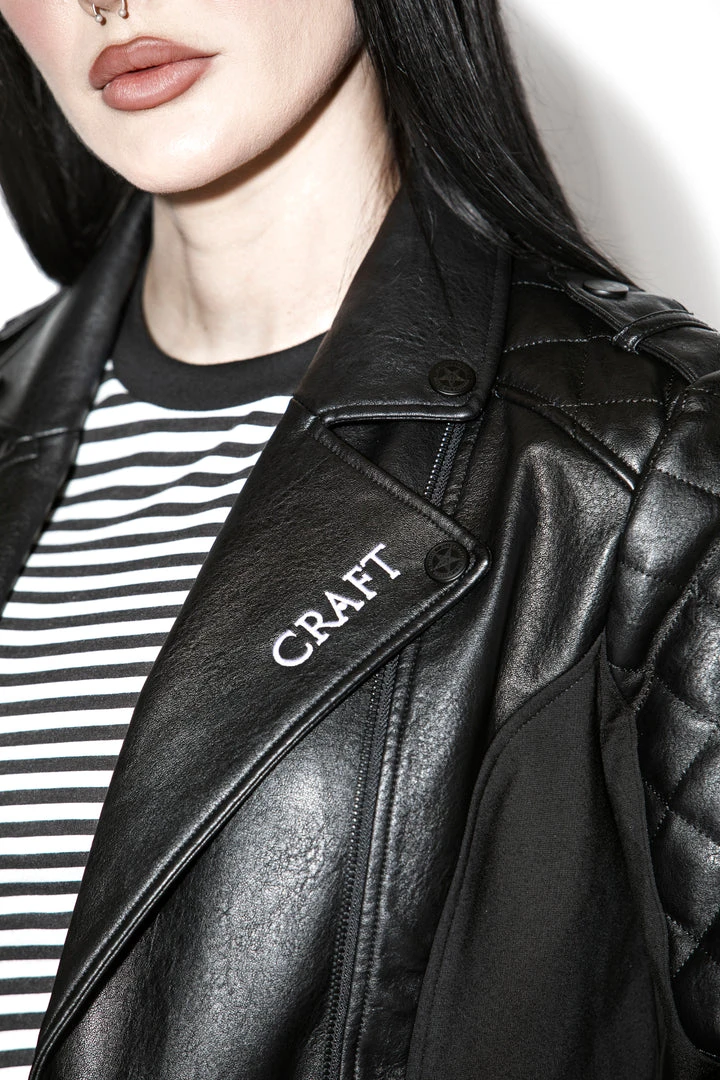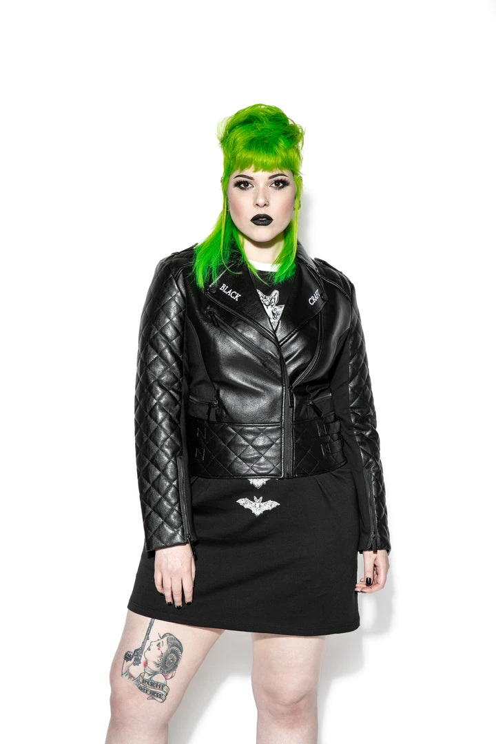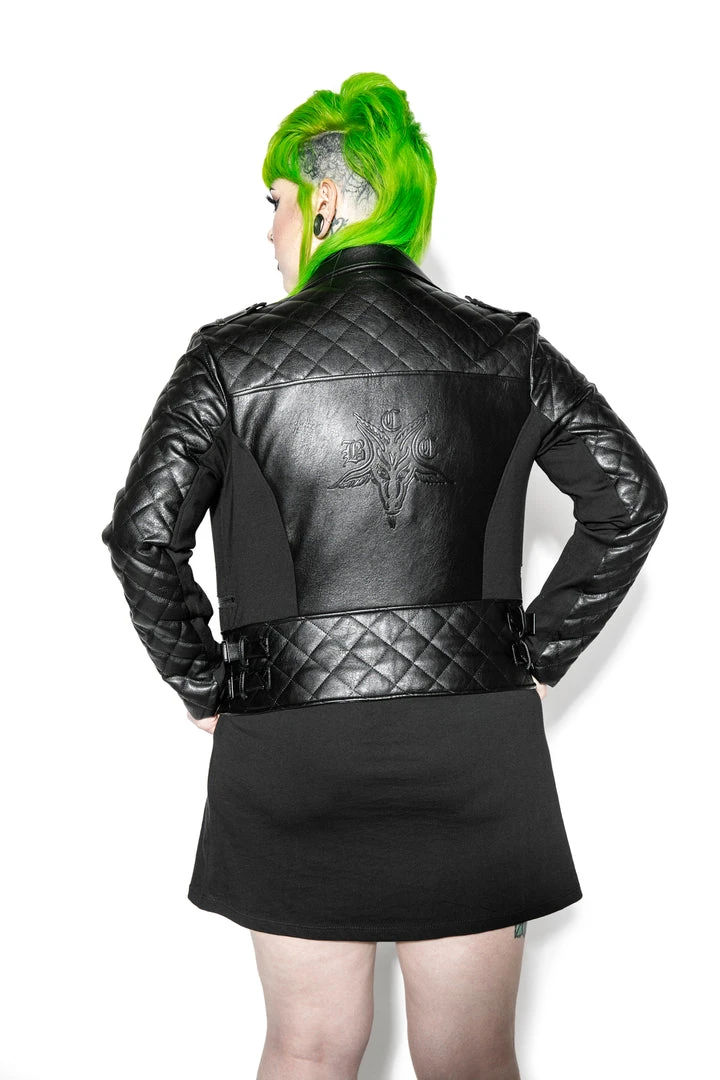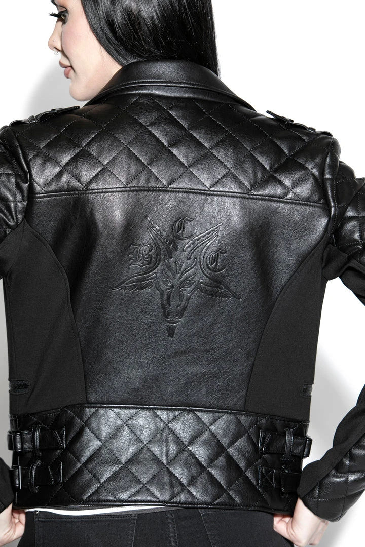 Our faux leather Women’s Moto Jacket comes with custom Blackcraft pentagram matte black buttons, custom lining & collar, and custom zipper pulls. It also has quilted arms and back with a smooth center, and buckle details on the sides. The back features an embossed BCC Goat.