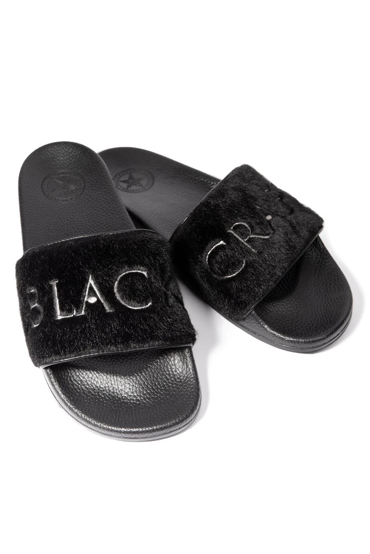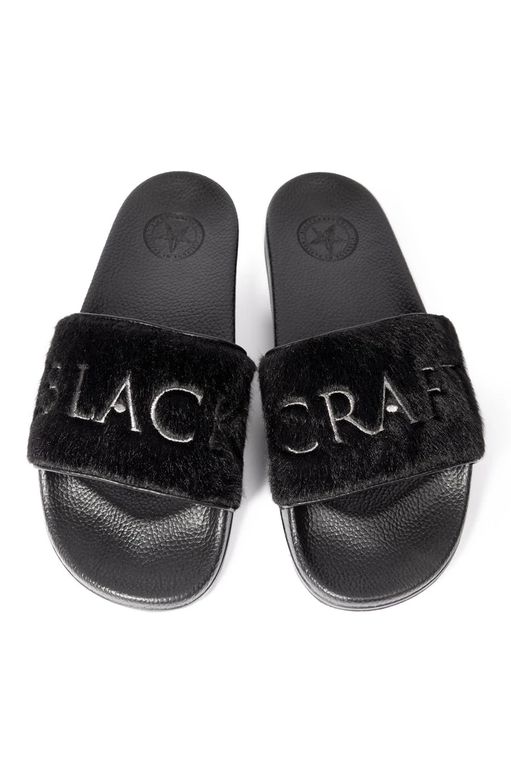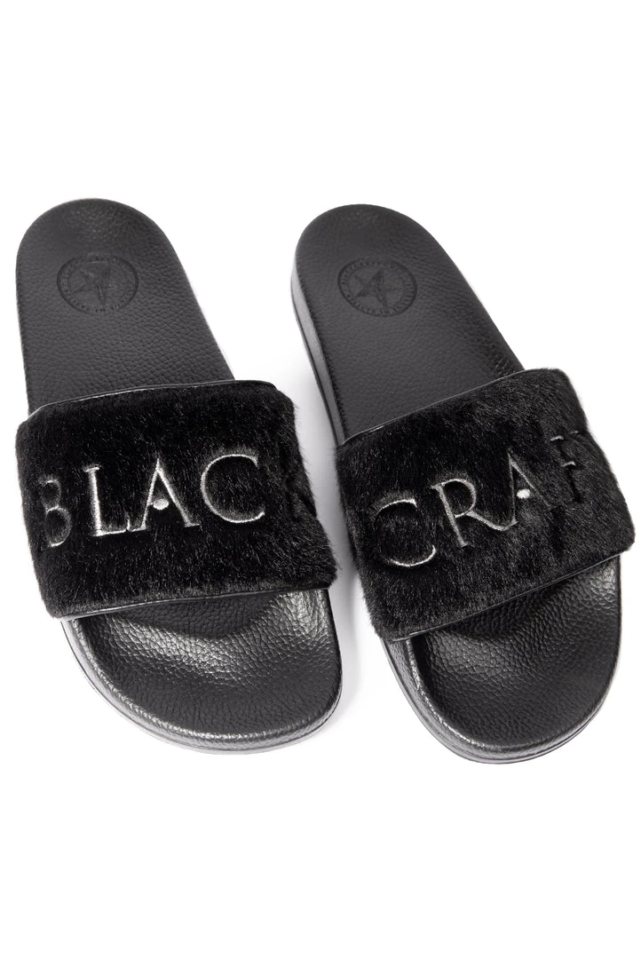 Premium quality pool slides with faux fur strap with Blackcraft embroidery.