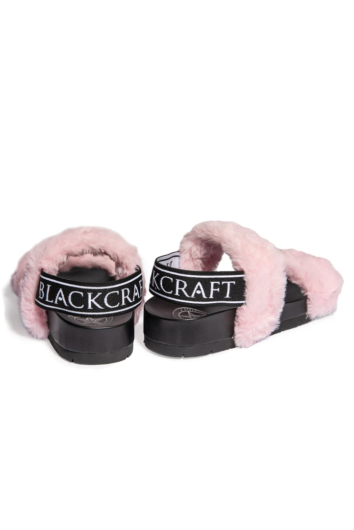 Channel your inner goth princess with these double strap, faux fur slides. Features logo tape back strap for secured comfort.