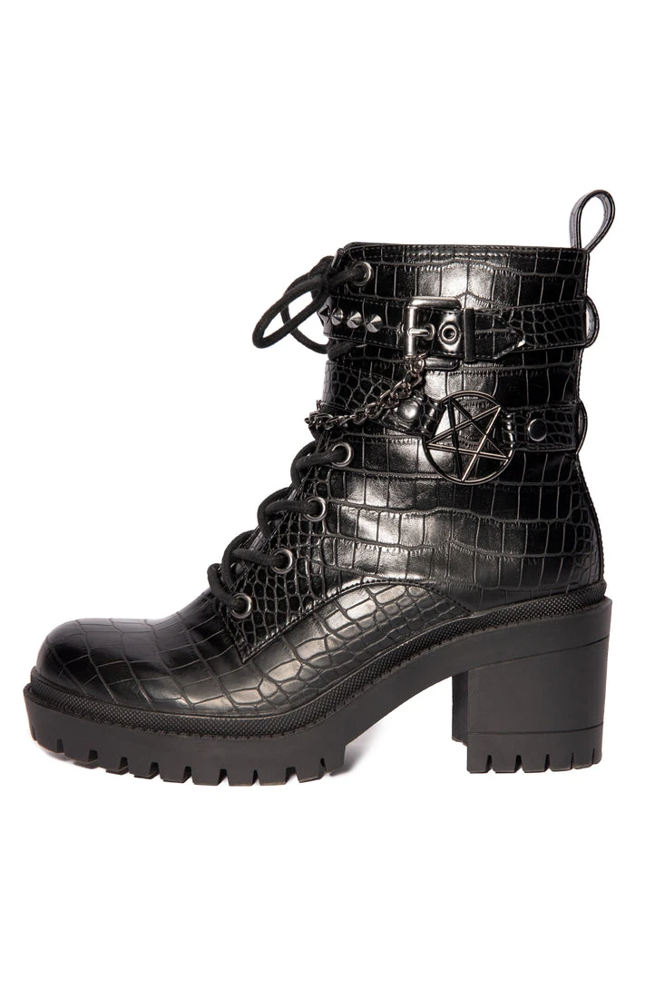 The black Lilith boot has a faux snake-skin body with strap details. Lower strap features a gunmetal pentagram while upper strap has spike and buckle details with a silver chain. The chunky heeled boot has a heavy lug sole and uses a zip closure with a Blackcraft zipper pull.