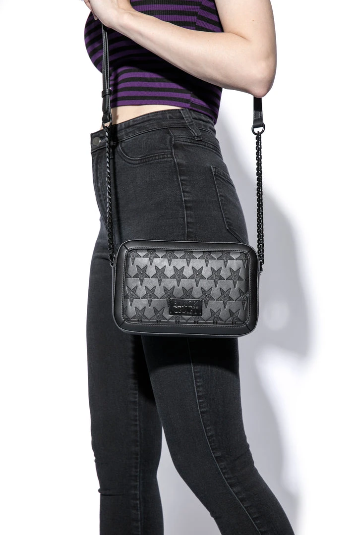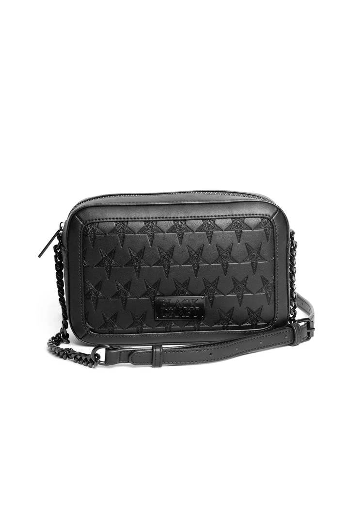 Faux leather crossbody embossed with allover baphomet print. Gunmetal finish logo zippers and logo plaque.