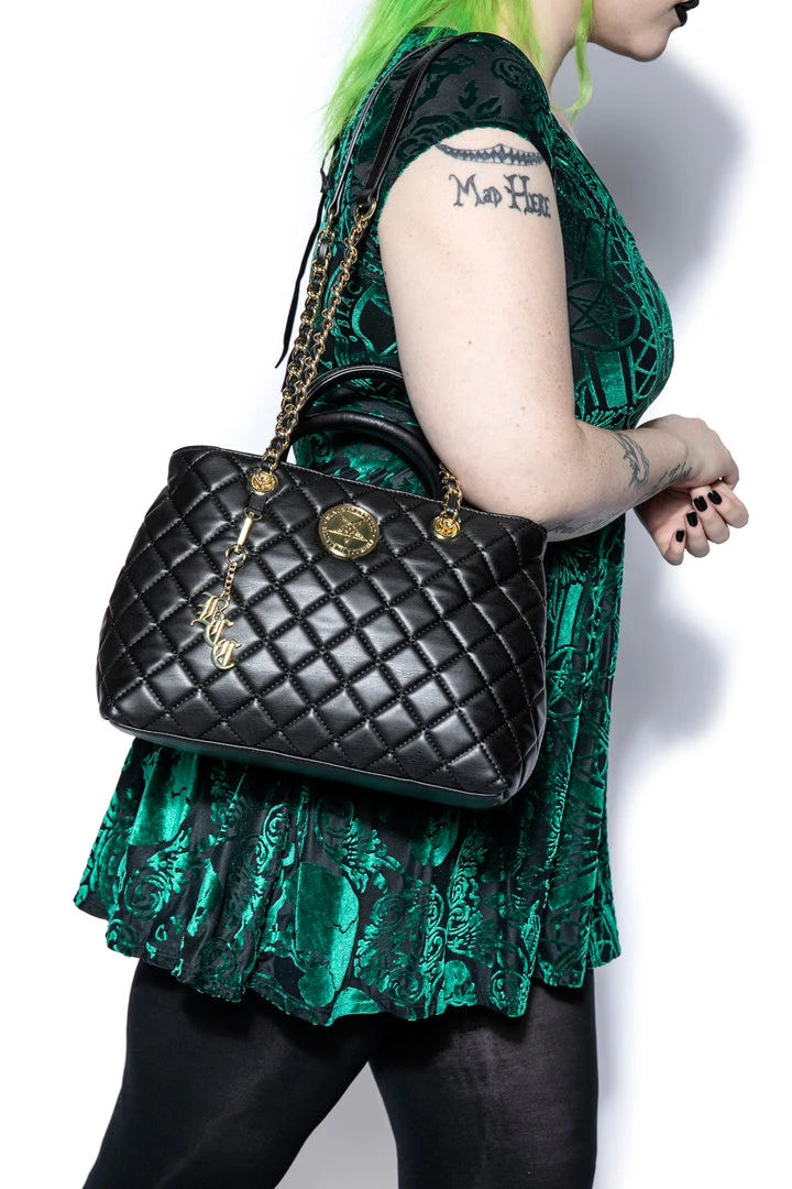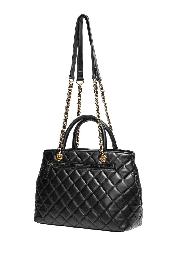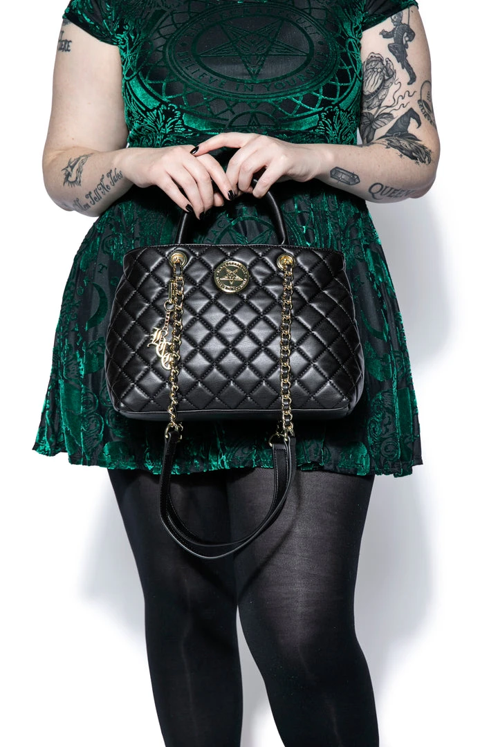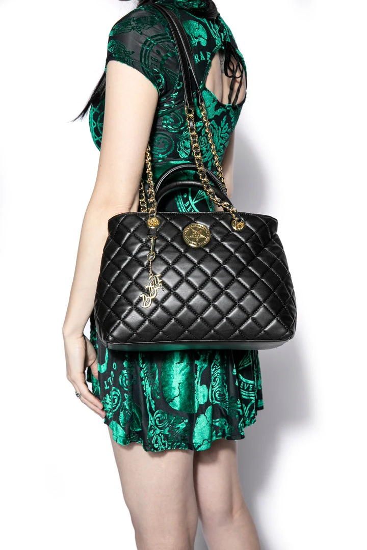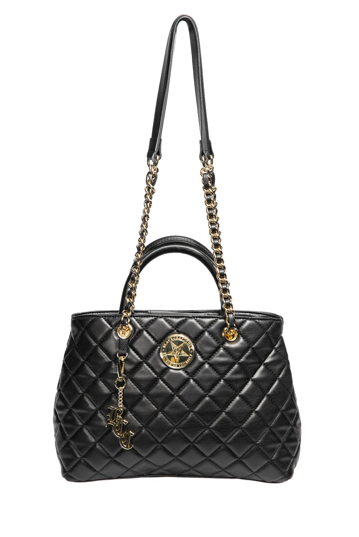 Black quilted satchel with magnetic closure. Features gold hardware, BCC keychain, and exterior zip pocket. Includes chain and leather straps and handles.