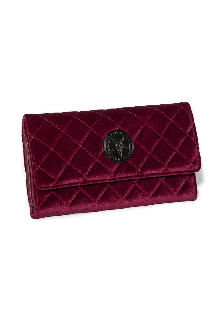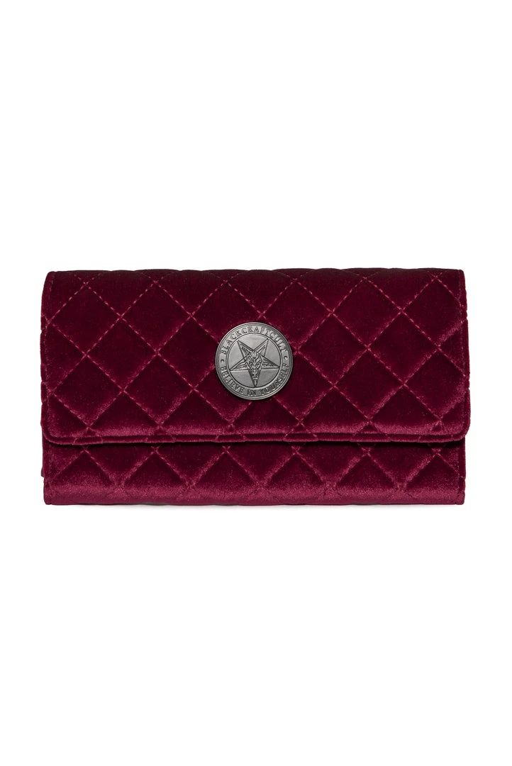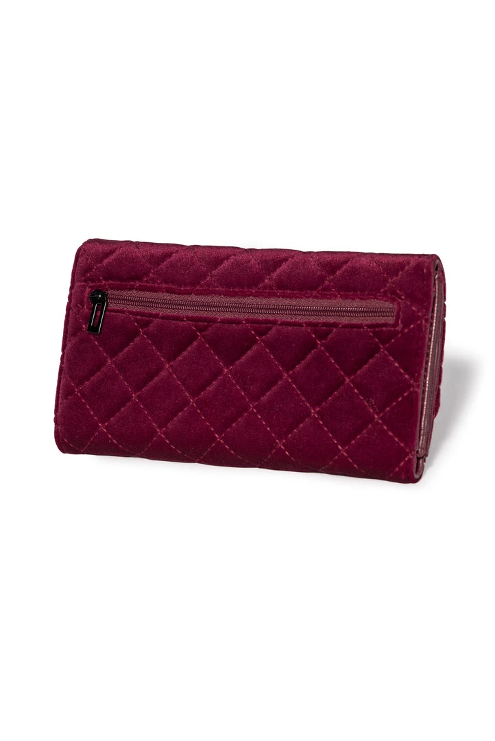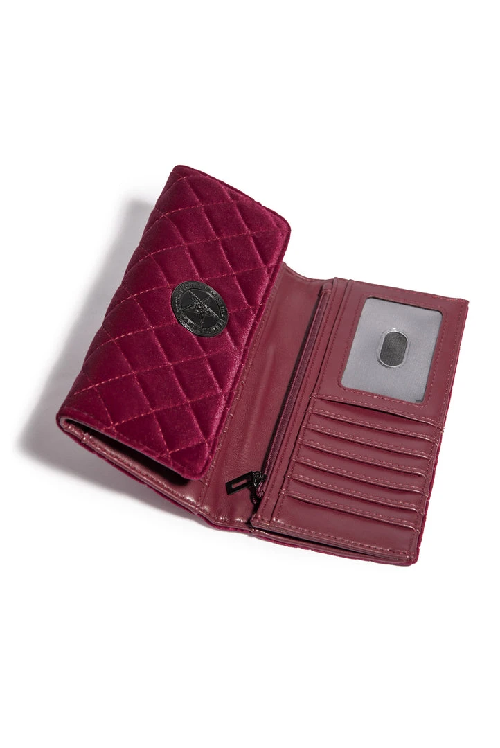 Quilted slim clutch wallet features quilted design with matte black hardware. Includes 15 credit card slots, interior pockets, zip pockets.