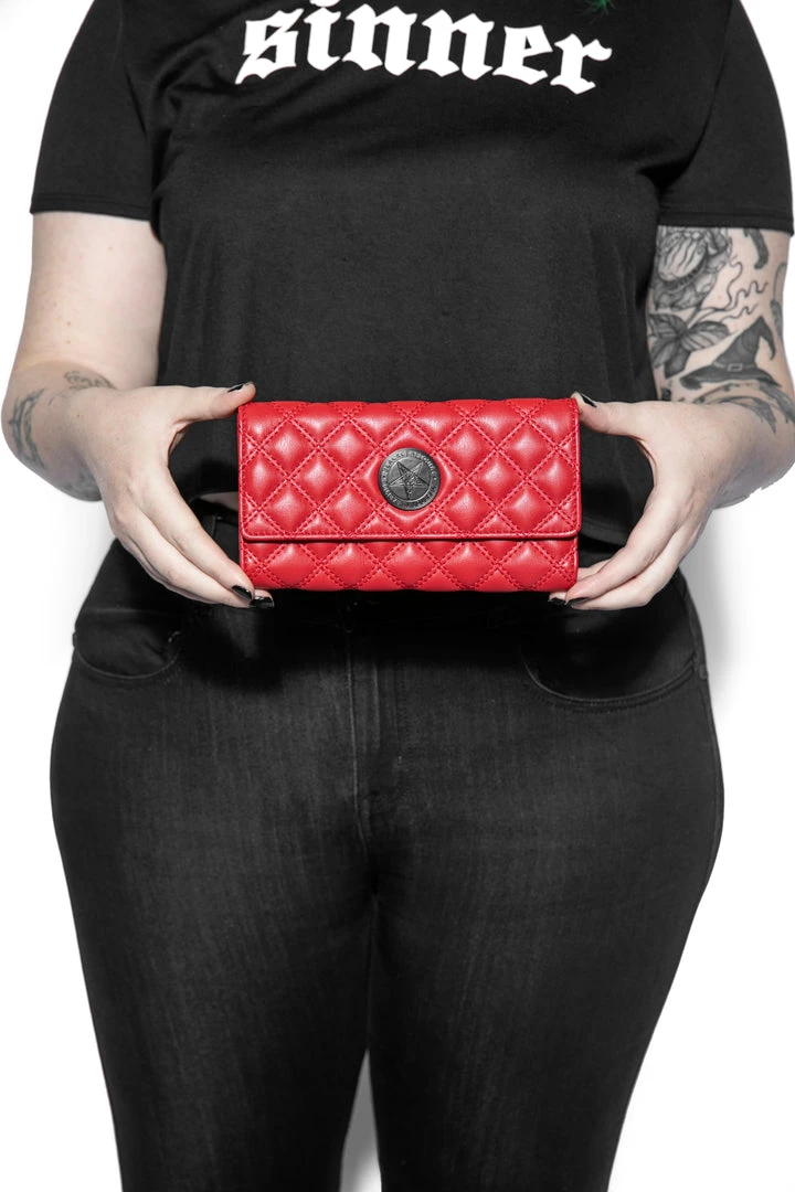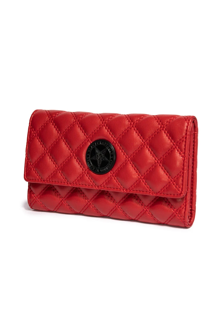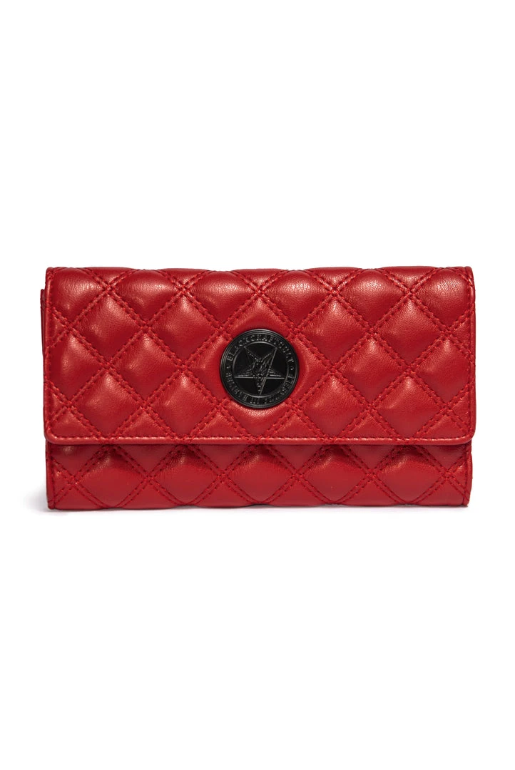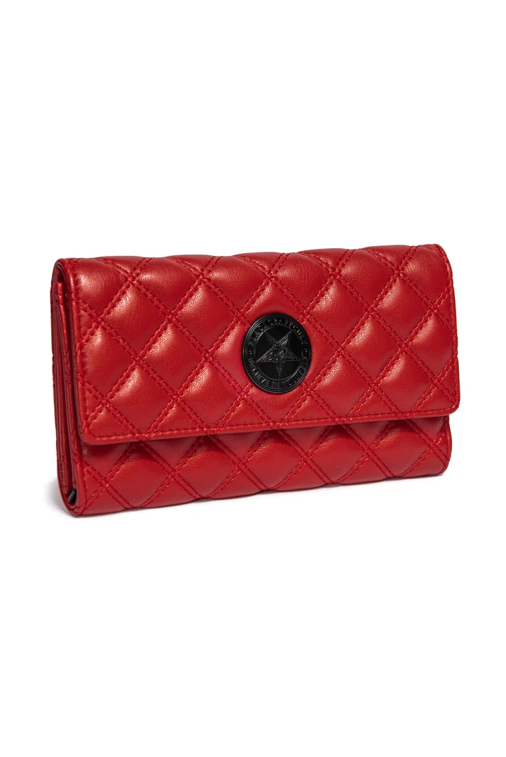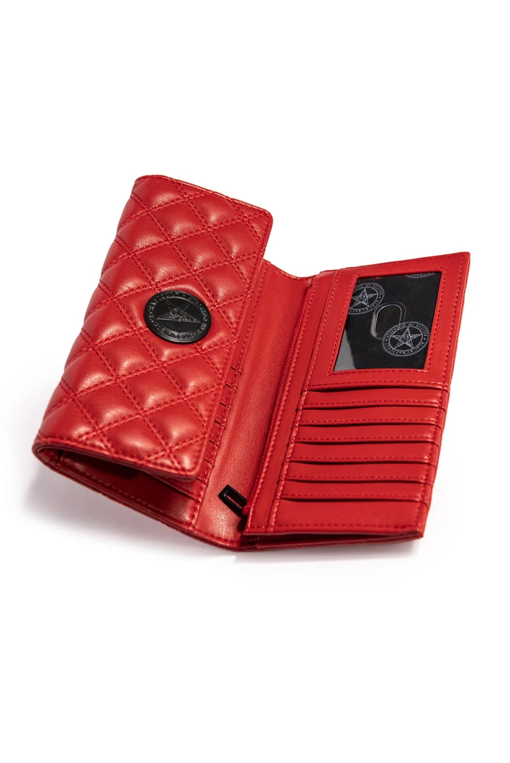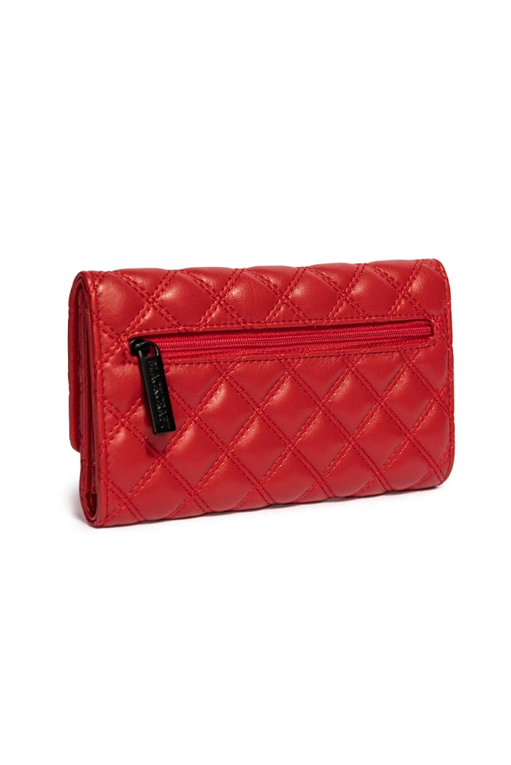 Faux leather slim clutch wallet features quilted design with matte black hardware. Includes 15 credit card slots, interior pockets, zip pockets.