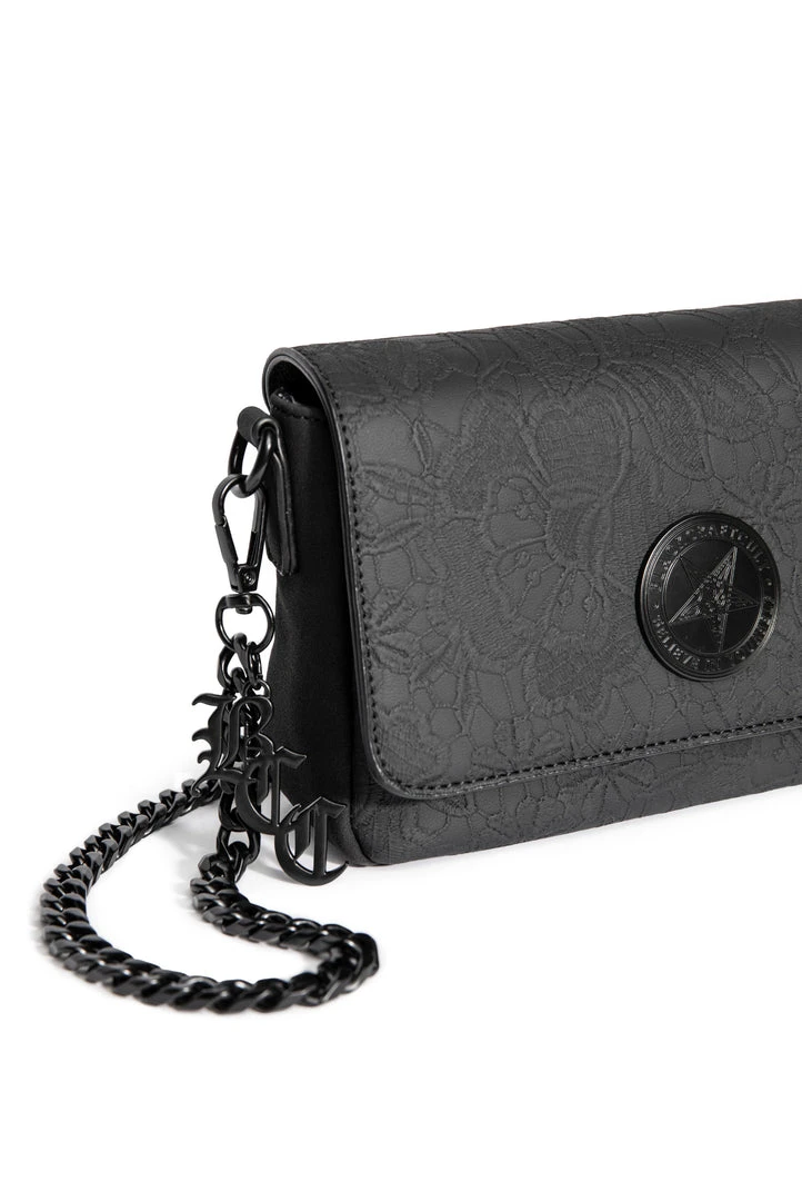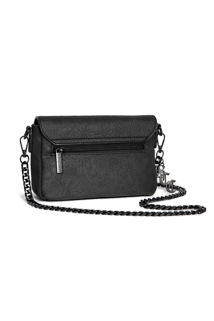 Dyed faux suede crossbody bag with PU leather floral overlay and crossbody strap. Features Believe in Yourself matte black logo hardware and flap closure.