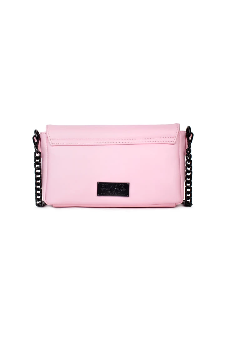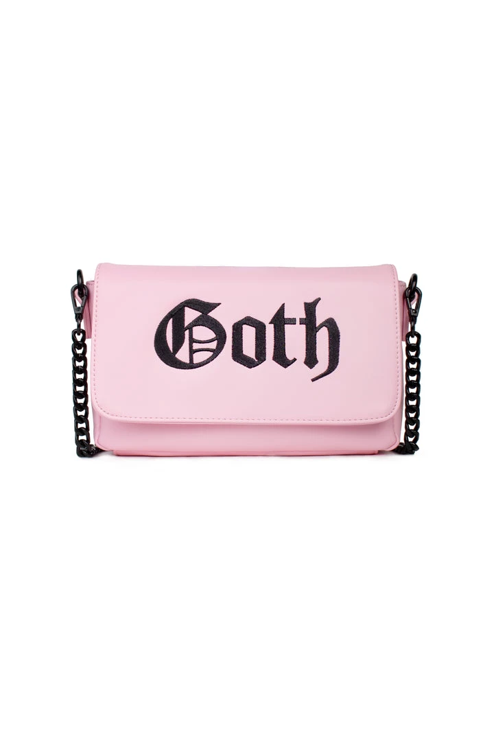 “Goth” embroidered text on faux leather crossbody with matte black finish hardware and premium quality chain. Removable crossbody strap allows to be carried as a clutch. Custom interior