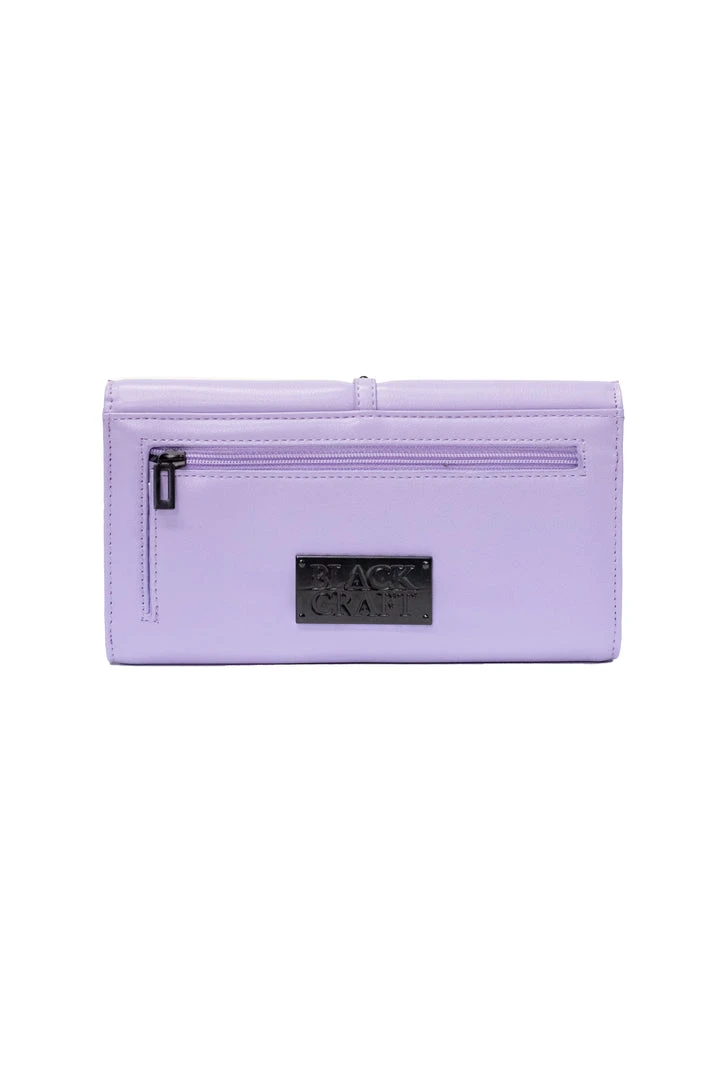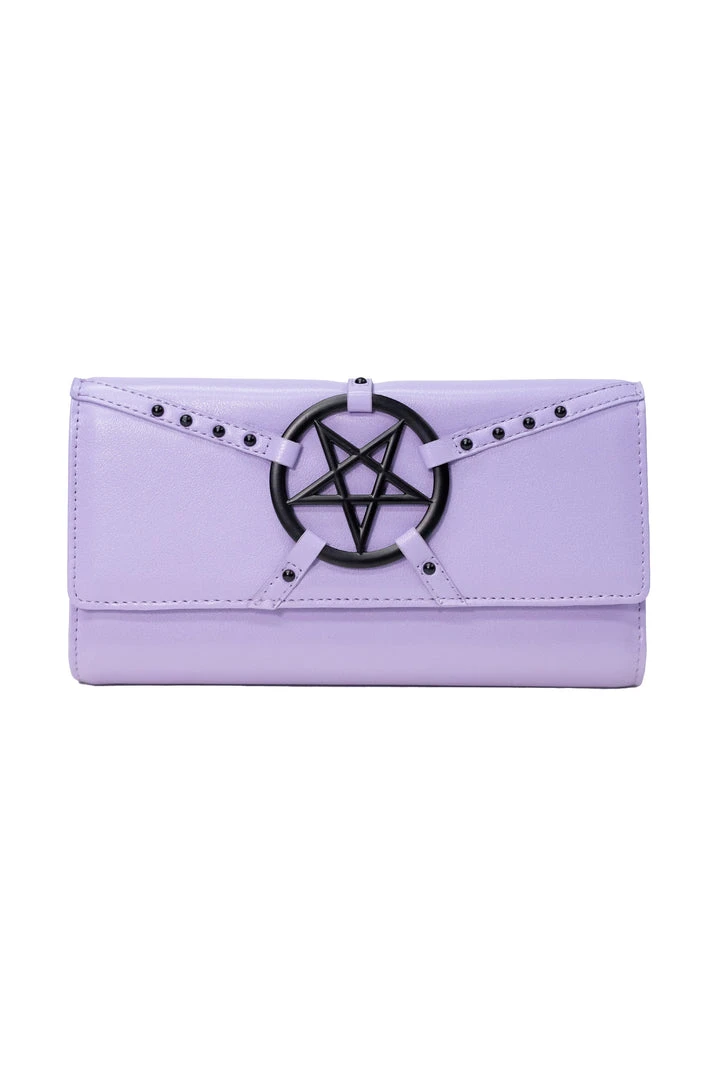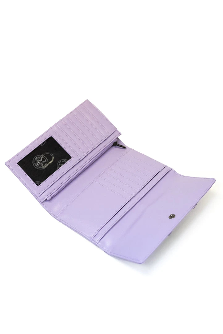 Faux leather slim clutch wallet features gunmetal finish pentagram harness on front. 16 credit card slots inside as well as an interior and exterior zip pocket.