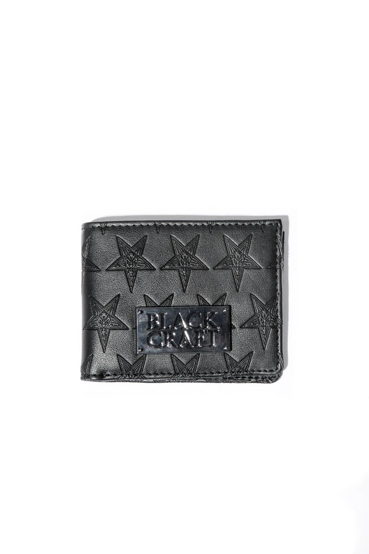 Faux leather bi-fold wallet with 6 credit card slots and bill compartment. Allover embossed baphomet print and gunmetal finish logo plaque hardware.