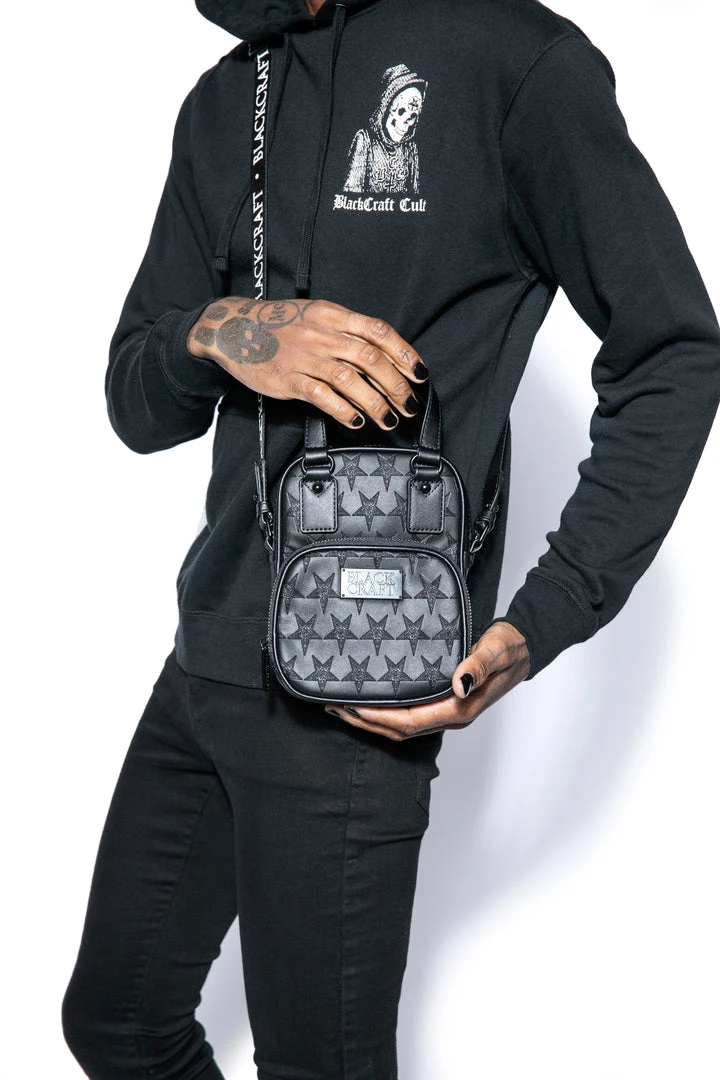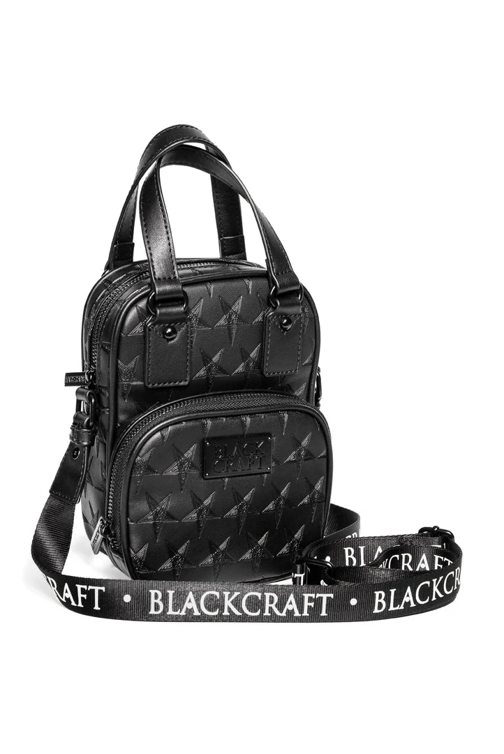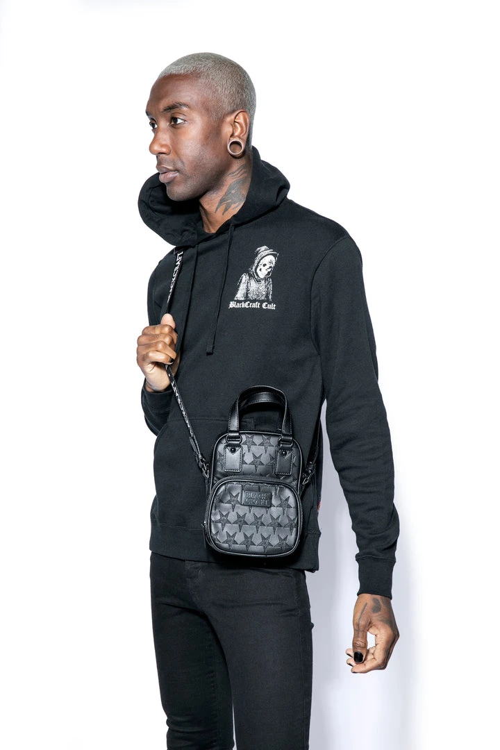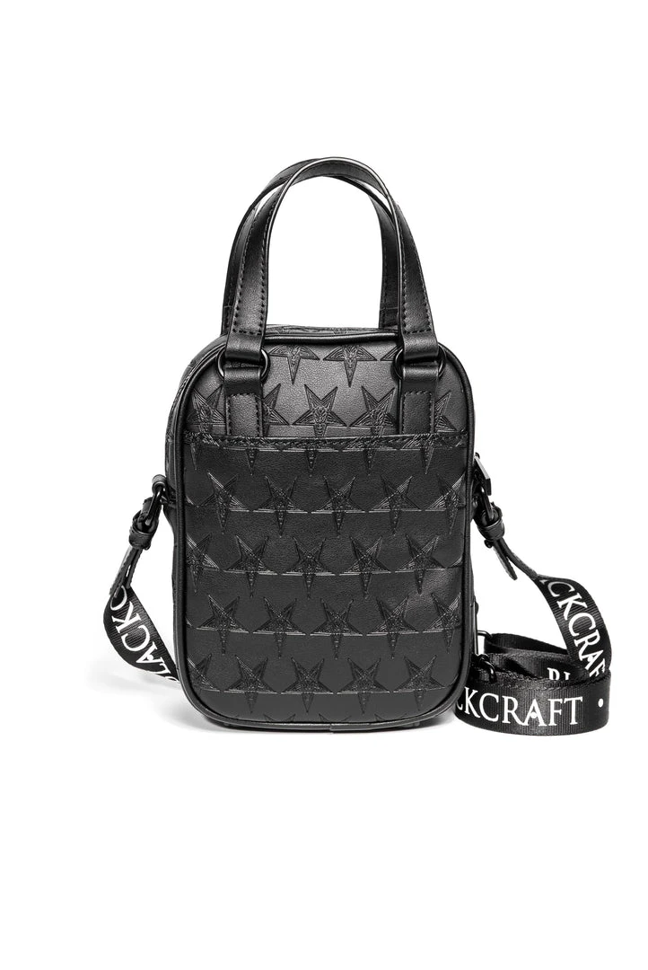 Faux leather carryall embossed with allover baphomet print. Gunmetal finish logo zippers and logo plaque. Adjustable strap