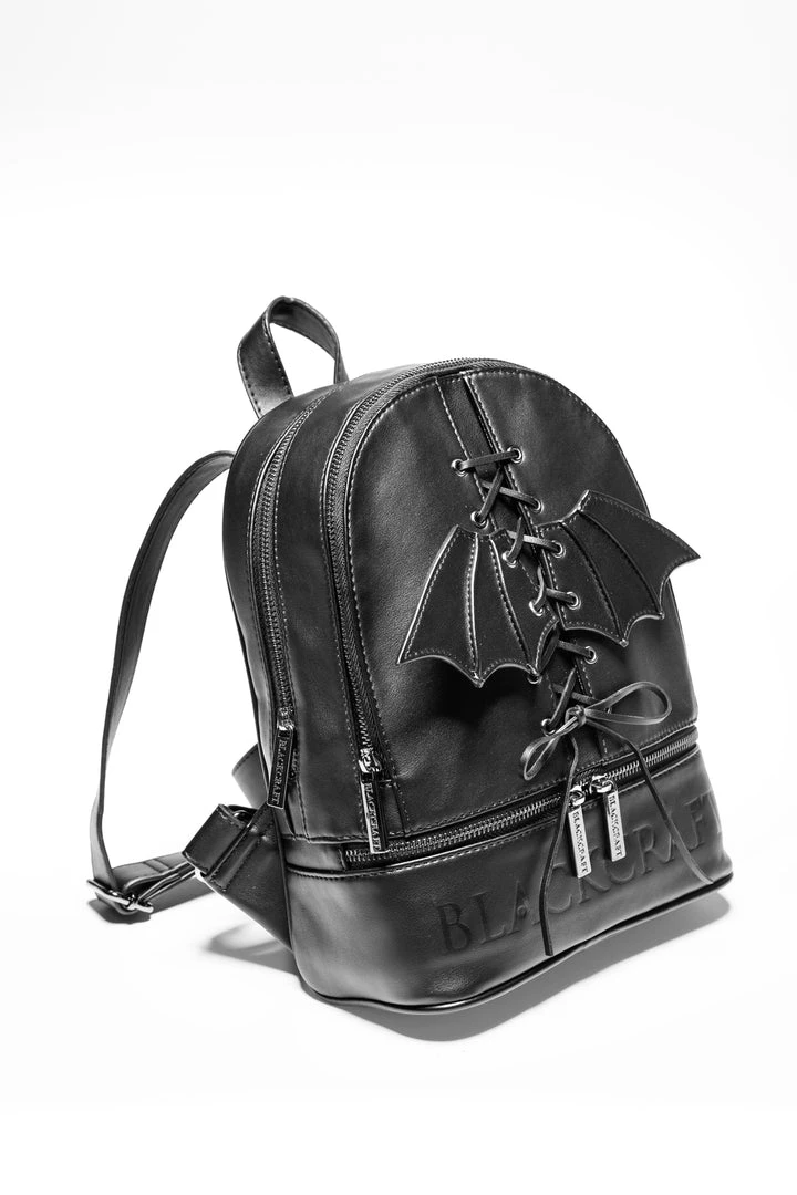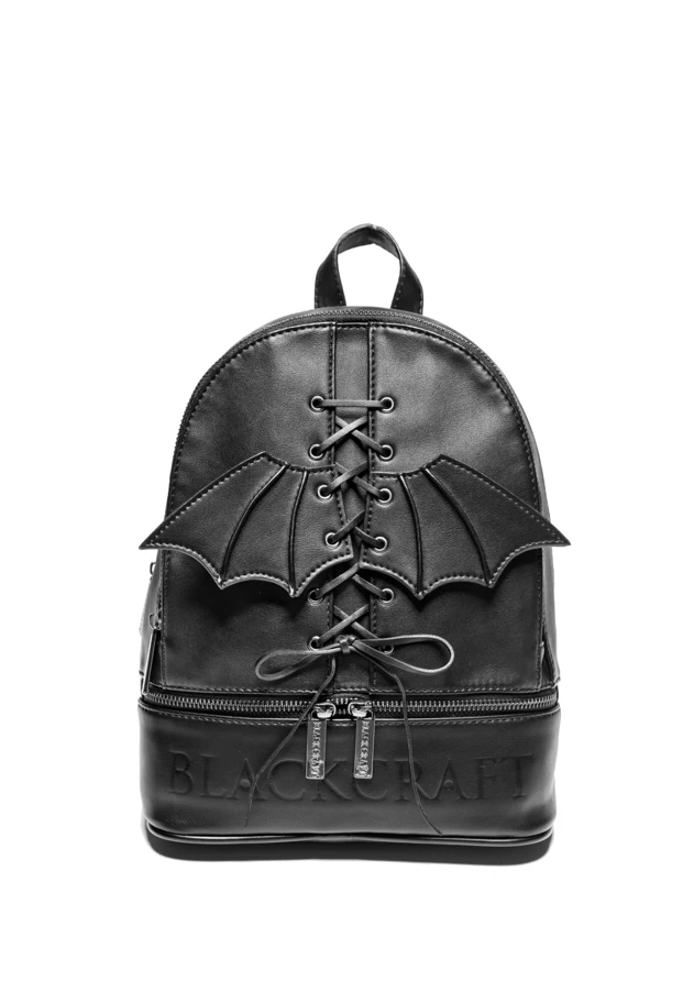 Faux leather medium sized backpack. Lace up 3D bat wing on front. Adjustable straps with gunmetal finish Blackcraft zippers. Interior features 1 zip pocket, 1 slit pocket and custom interior lining