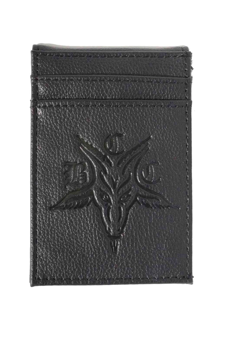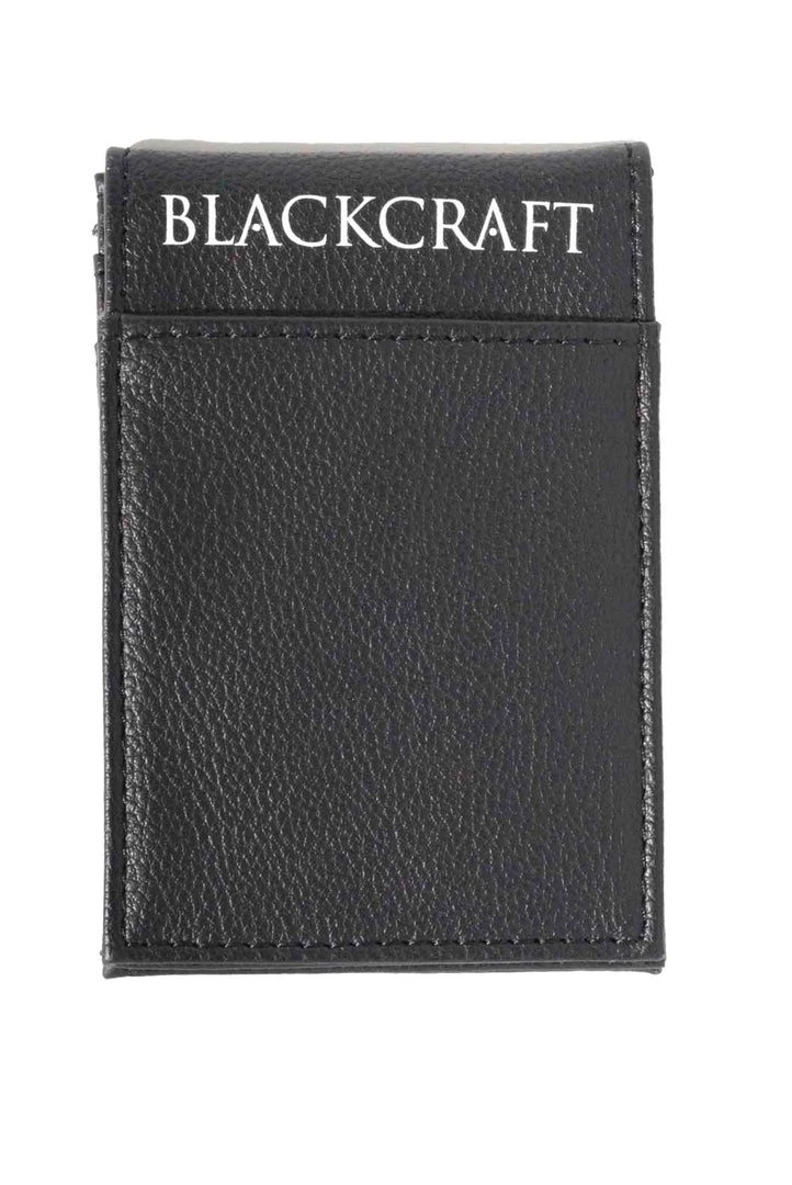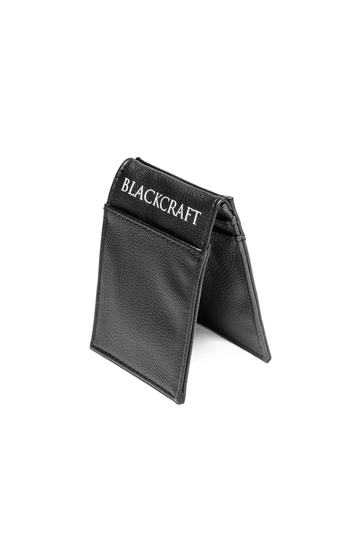 Faux leather slim wallet with โBCC Goatโ art embossed on front and Blackcraft logo printed on back. Features 3 credit card slots on the outside and 3 on the inside. Magnetic closure.