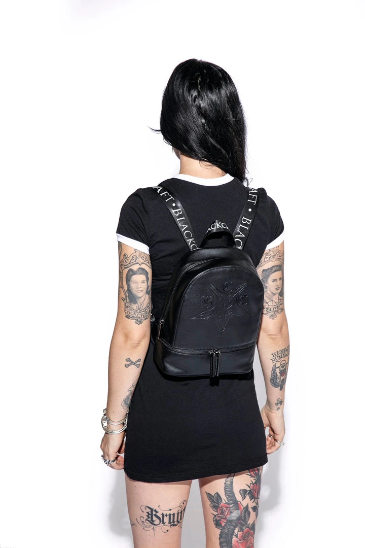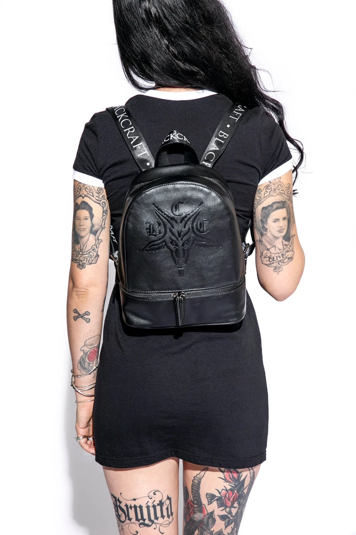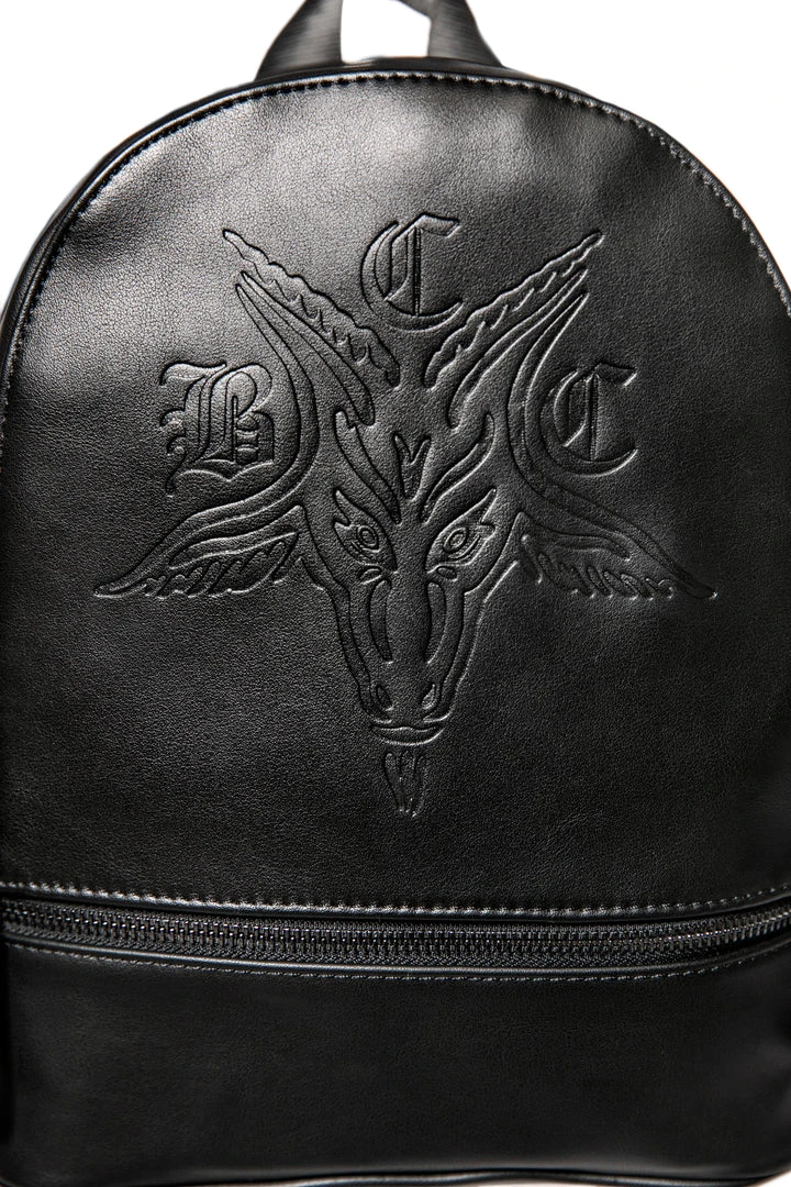 Faux leather medium sized backpack. Embossed BCC Goat logo on front. Adjustable Blackcraft logo webbing straps with gunmetal finish Blackcraft zippers. Interior features 1 zip pocket, 1 slit pocket and custom interior lining.
