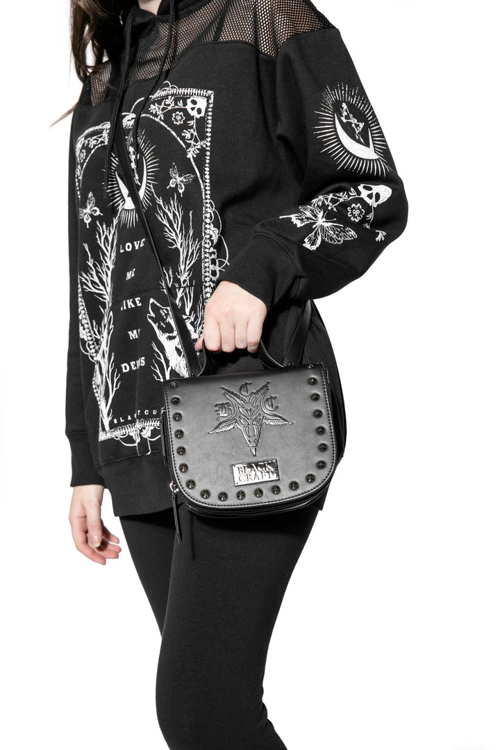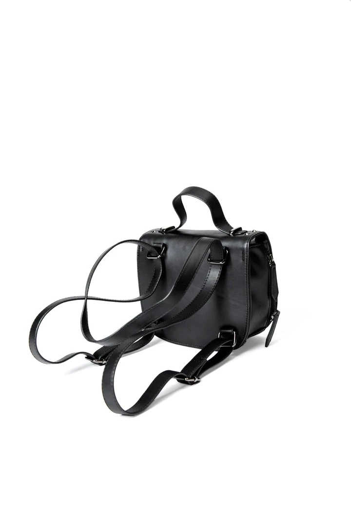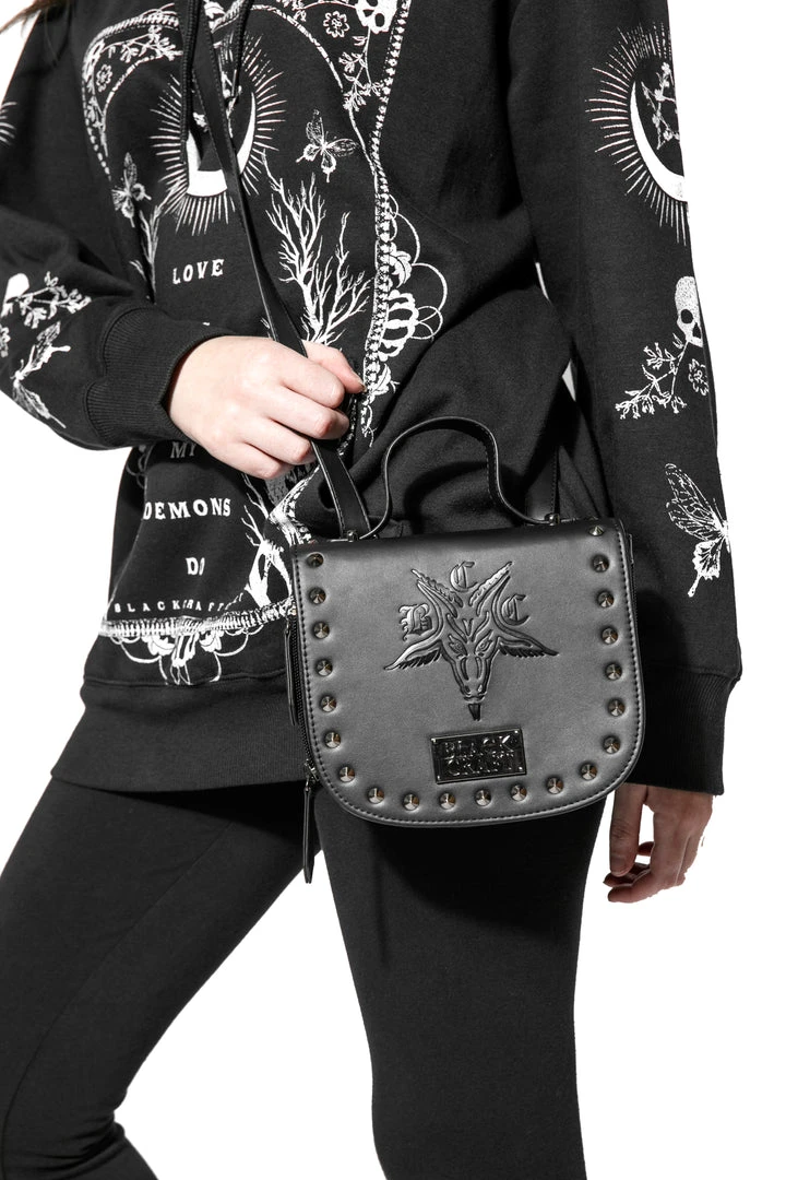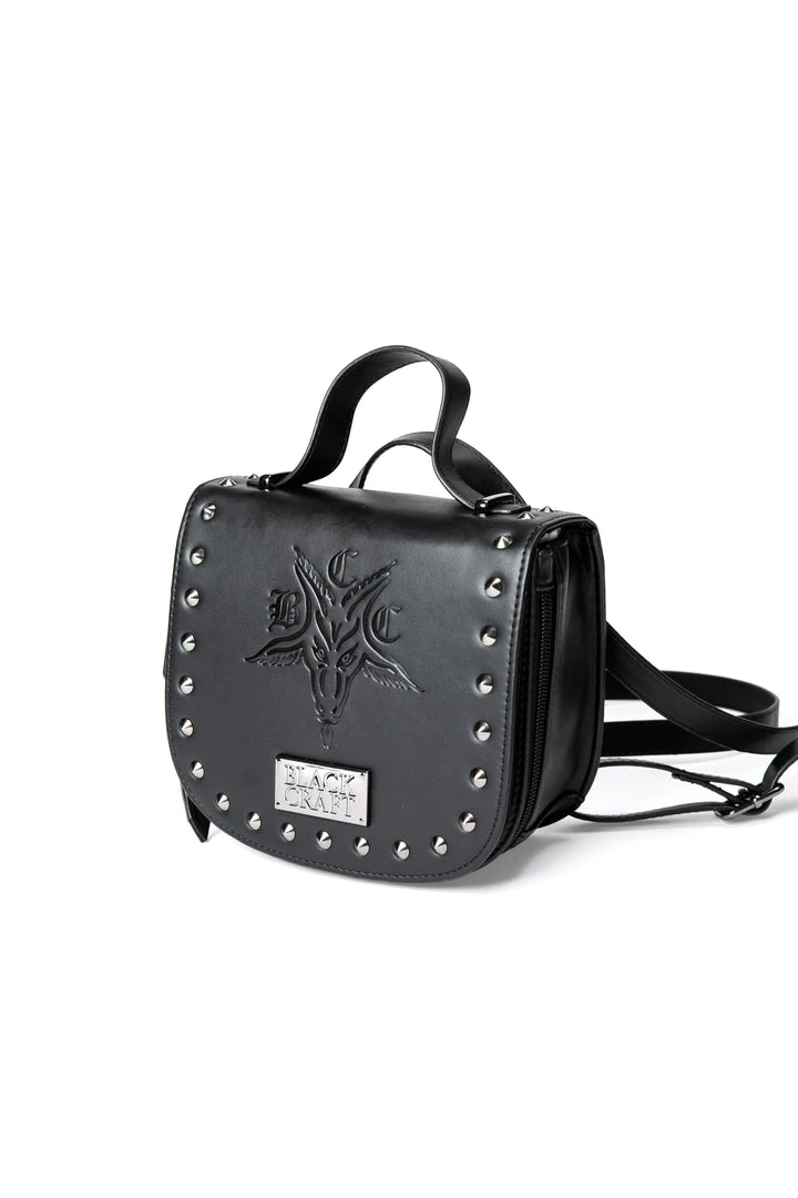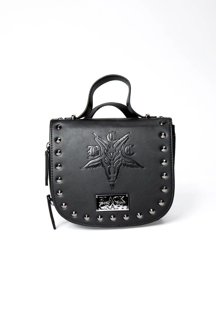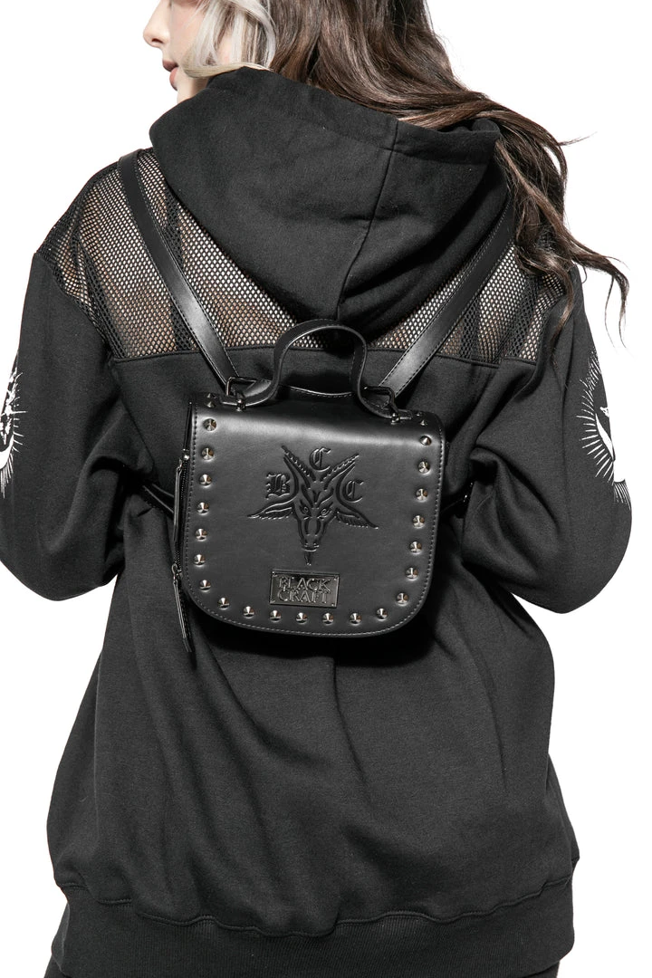 Interchangeable mini backpack to crossbody with BCC Goat embossed and gunmetal hardware on the front. Flap button closure and zipper details.