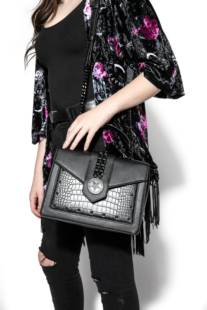 Faux leather square top handle with adjustable and removable crossbody strap. Flap magnetic button closure with matte black Believe in Yourself hardware and chain detailing.