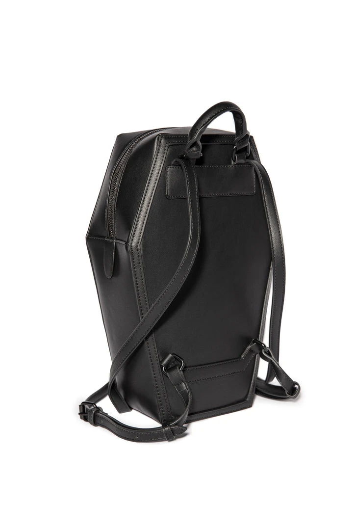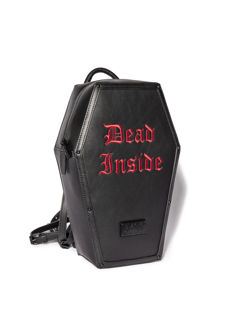 Faux leather coffin shaped backpack with “Dead Inside” embossed on front. Features adjustable straps and custom interior print lining.