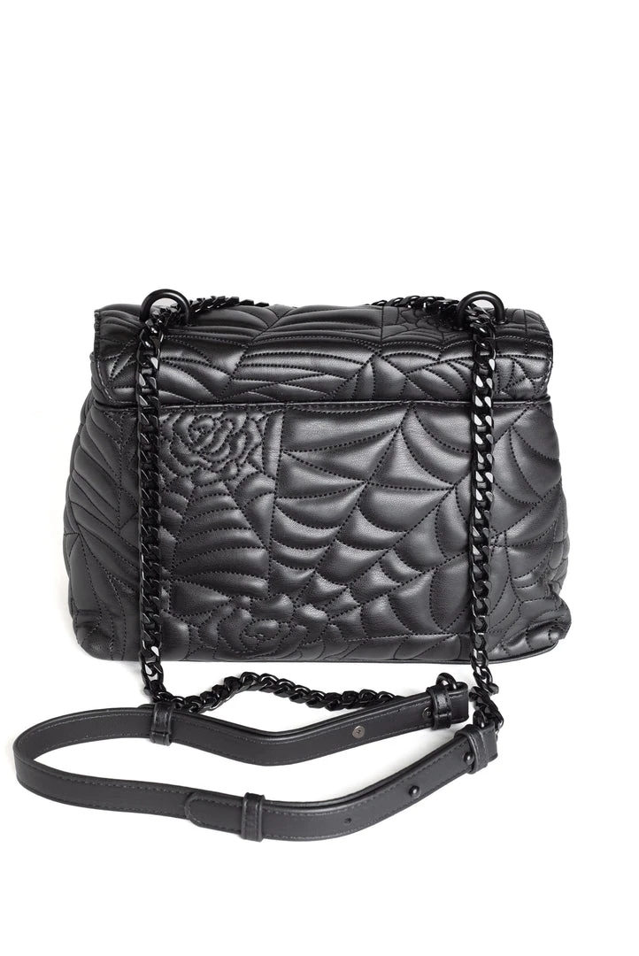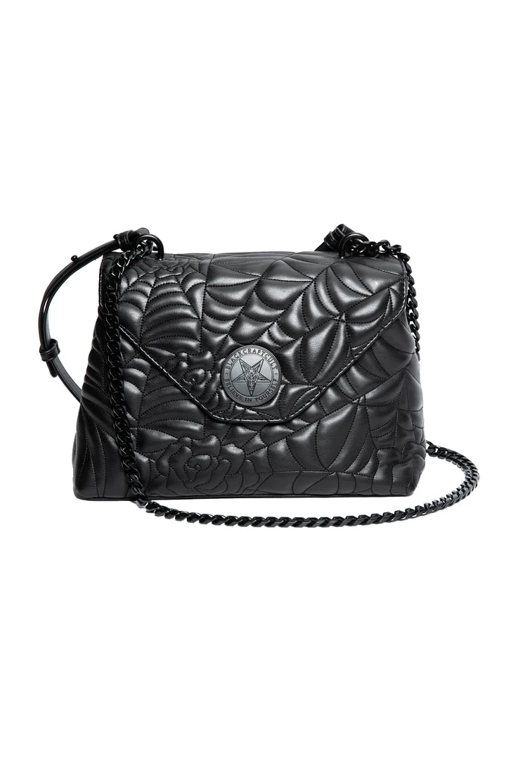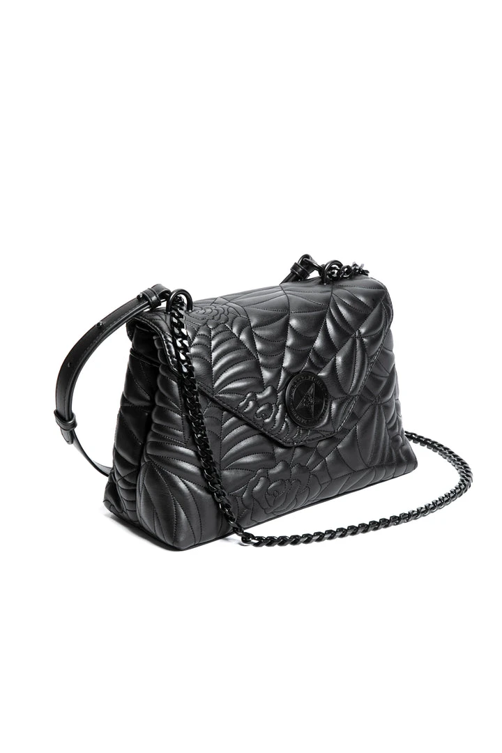 Spider web inspired shoulder bag with adjustable strap. Features flap closure with matte black Believe in Yourself hardware.