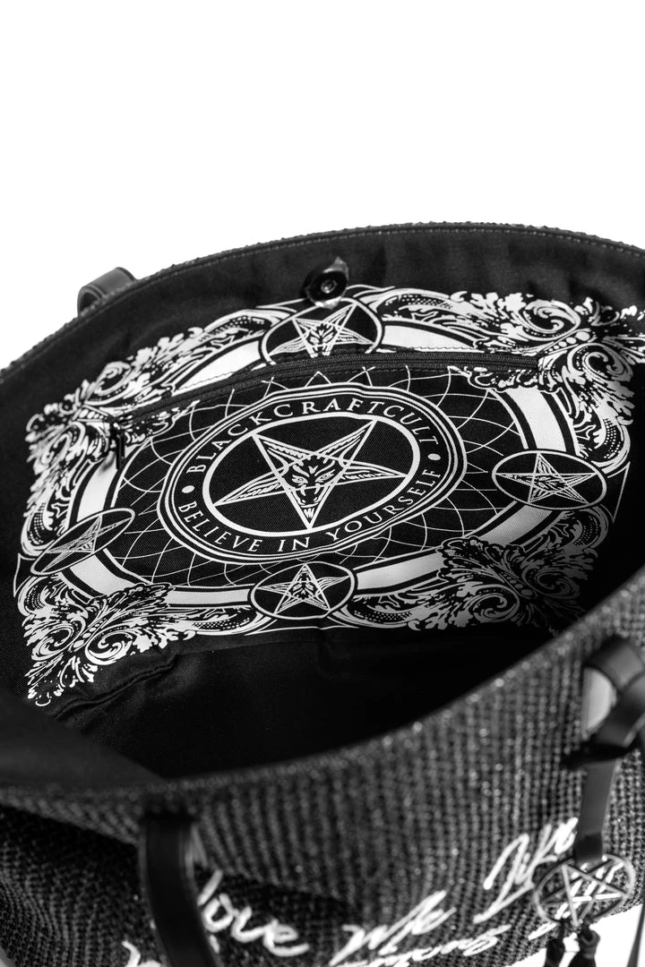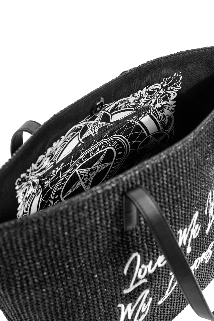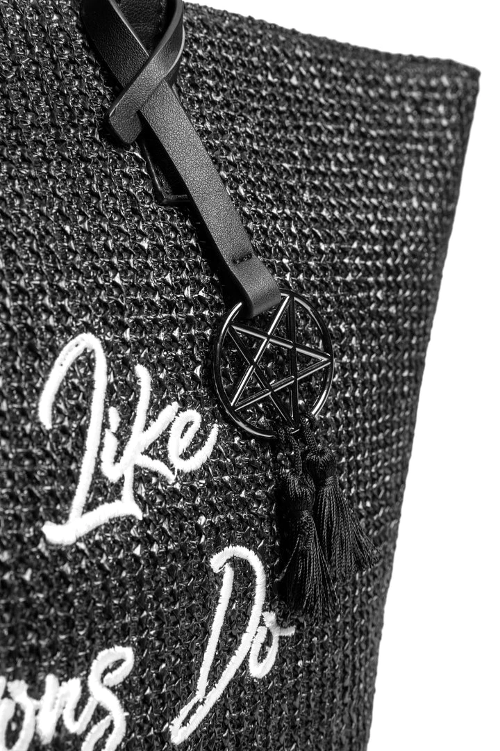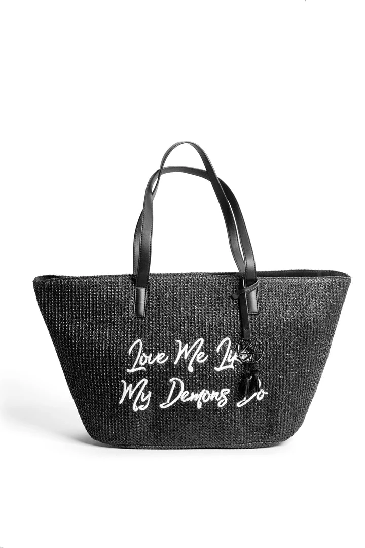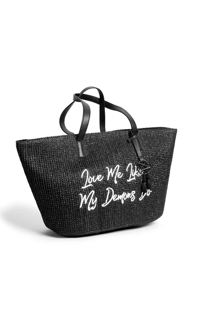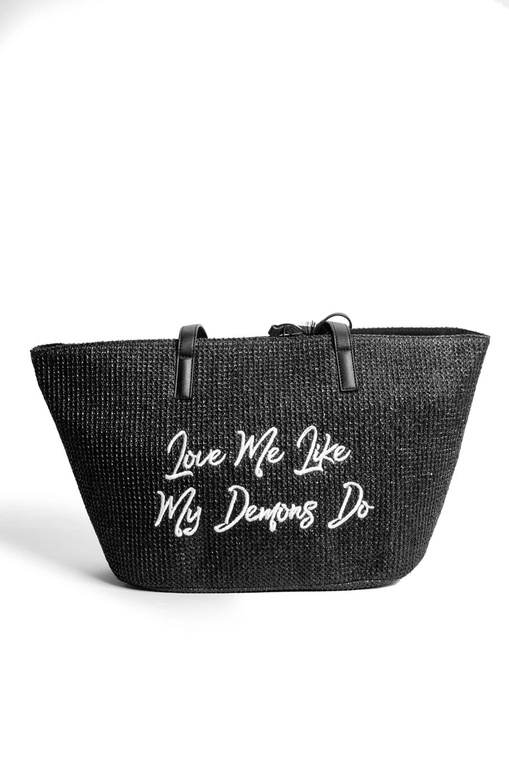 Straw Tote with embroidered “Love Me Like My Demons Do” detail. Features an inside pocket.
