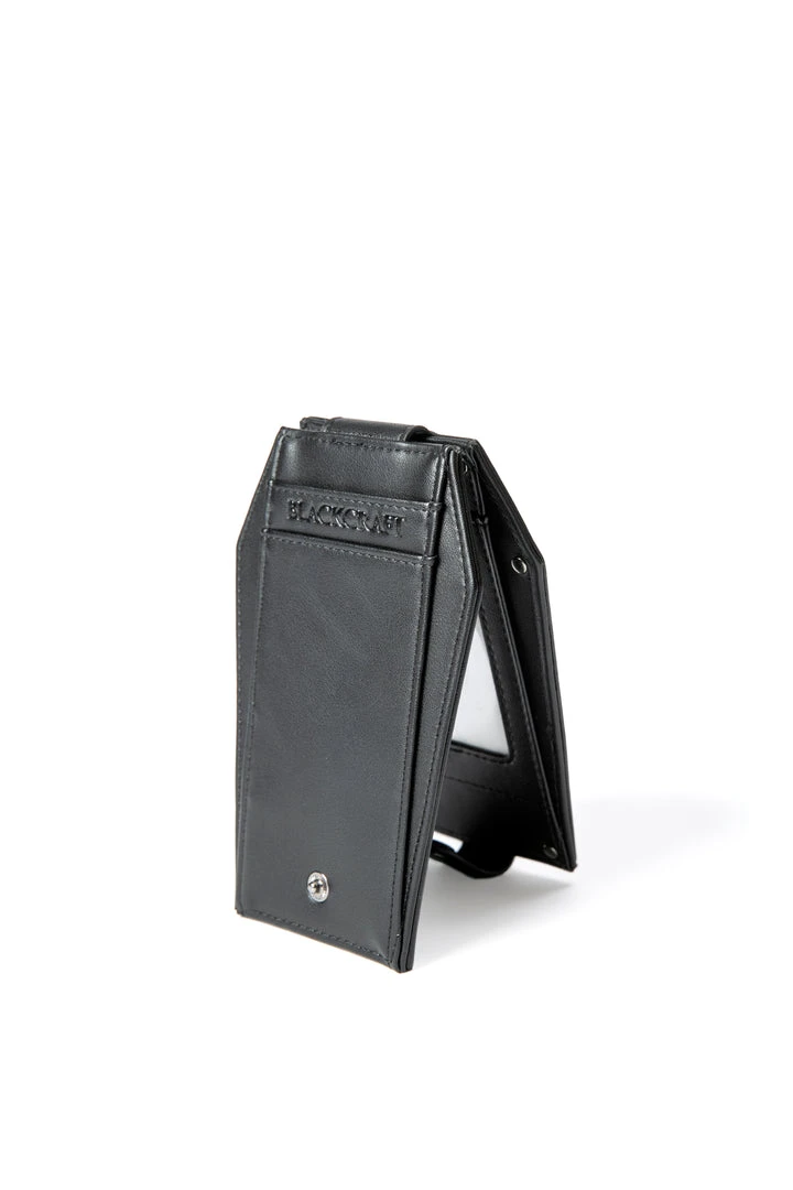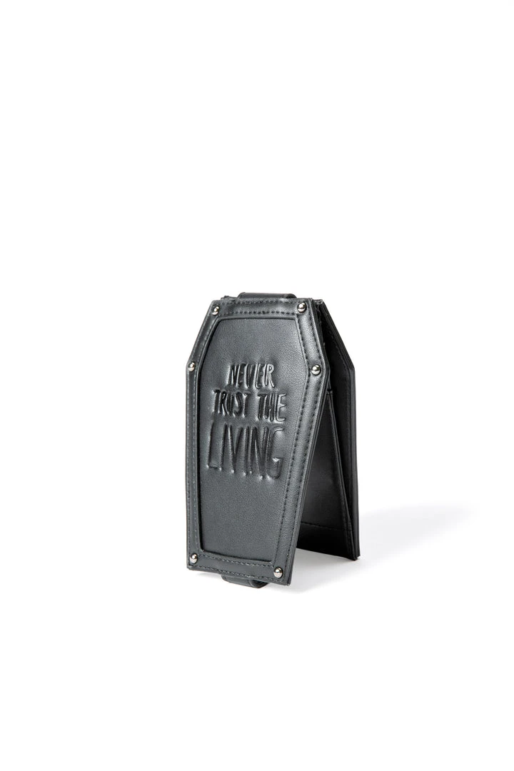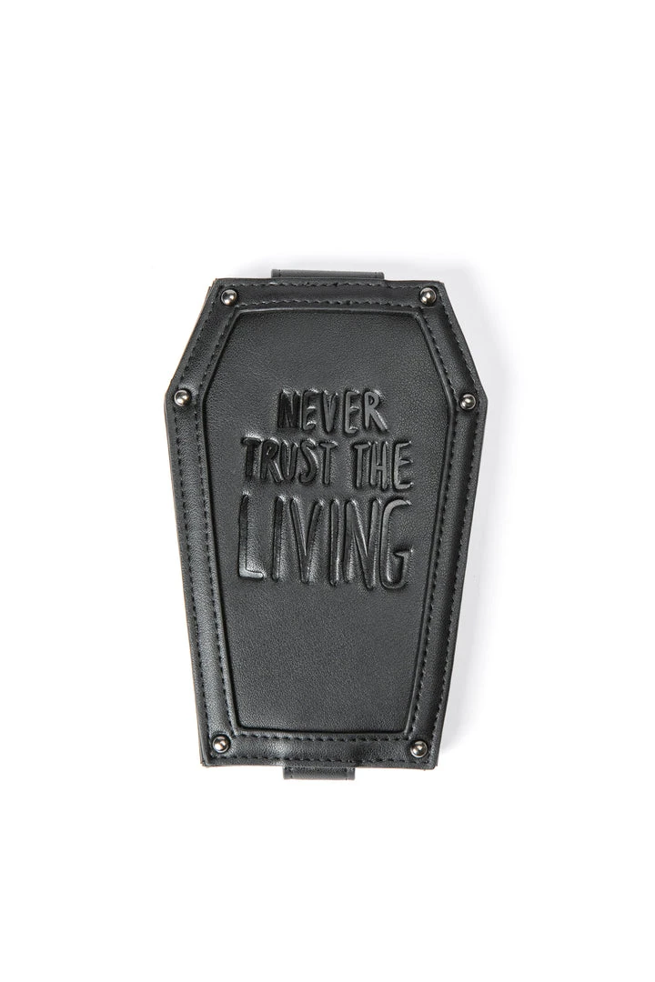 Faux leather cardholder in coffin shape with Never Trust the Living embossed on the front. Inside features ID and card slots with button closure and extra card slots on the back.