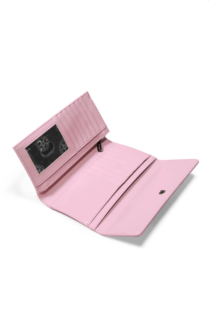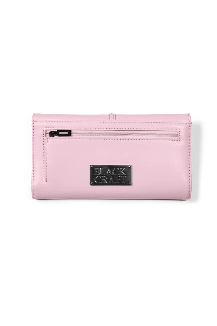 Faux leather slim clutch wallet features gunmetal finish pentagram harness on front. 16 credit card slots inside as well as an interior and exterior zip pocket.