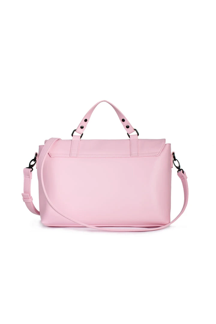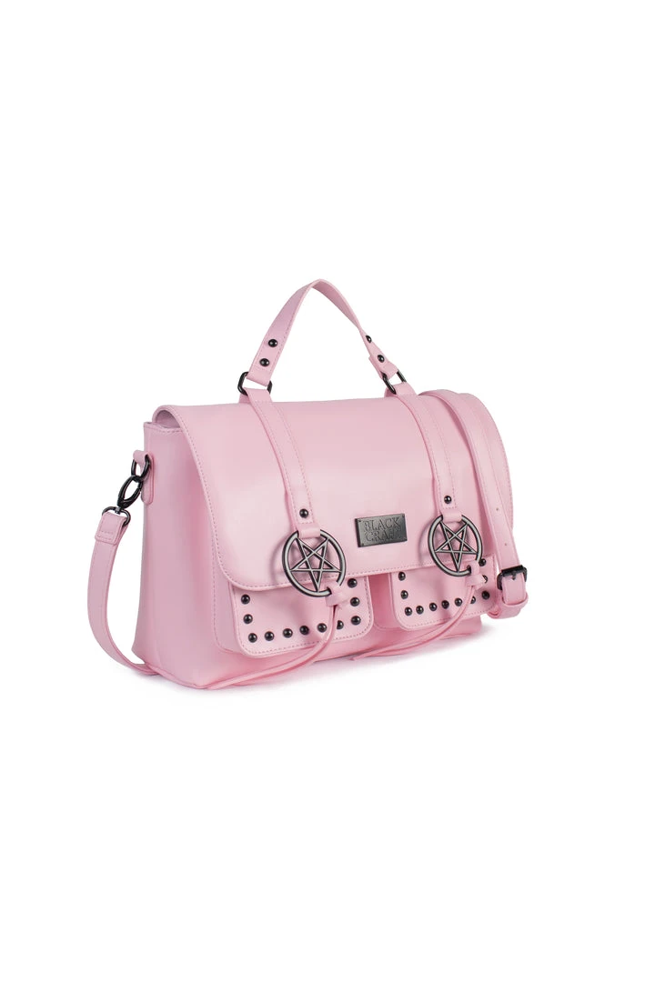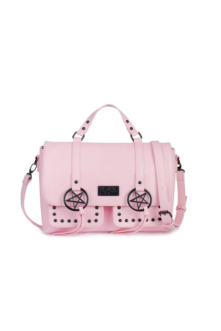 Pink faux leather messanger bag with matte black finish pentagrams and Blackcraft logo plaque. 46″ adjustable removable crossbody strap included. Interior features 1 zip pocket, 1 slit pocket and custom interior lining.