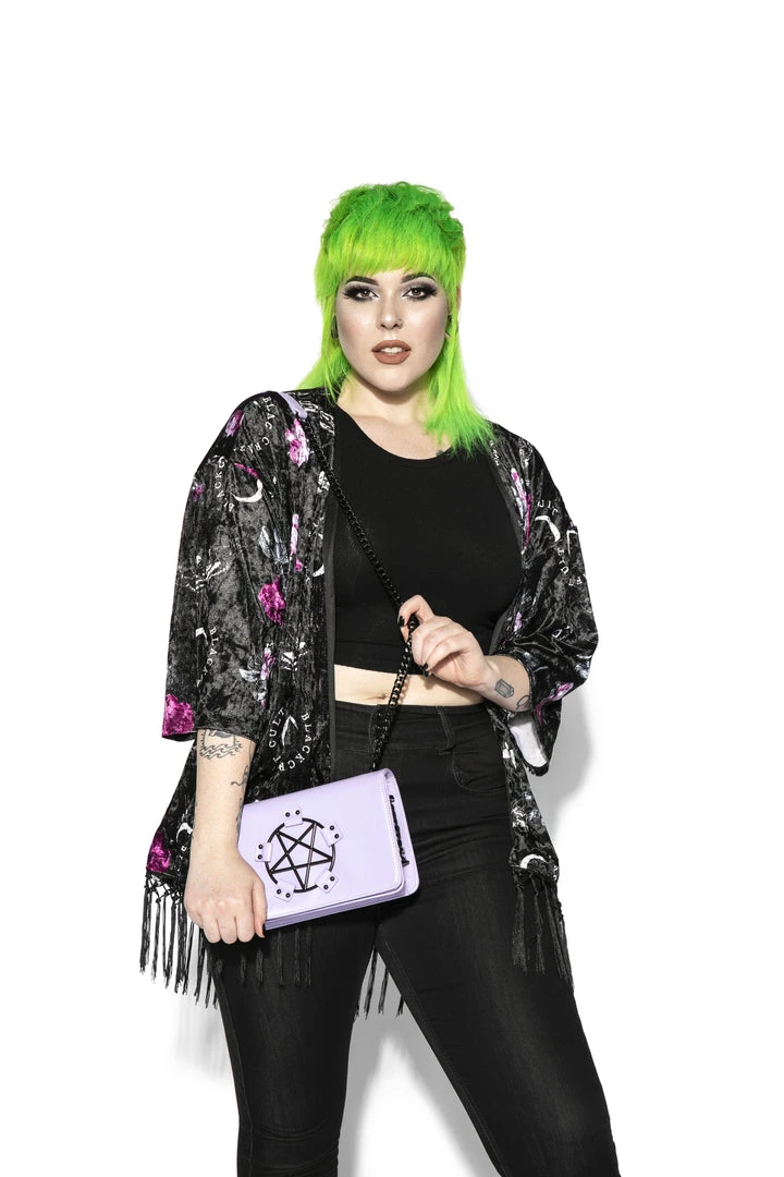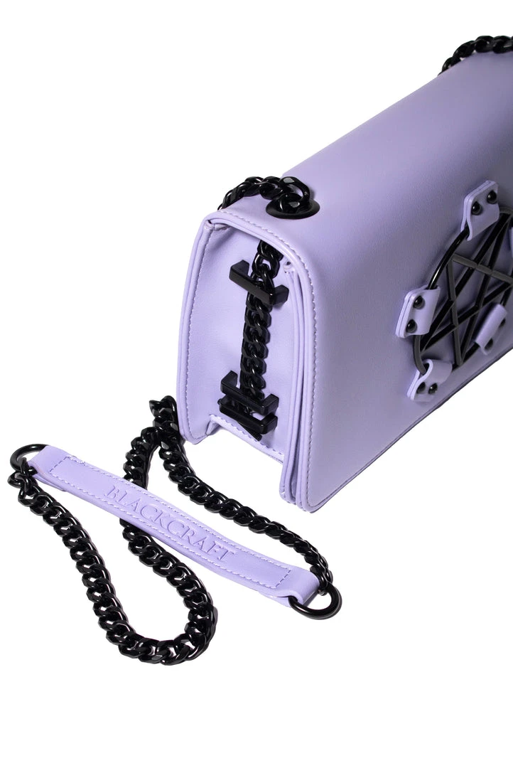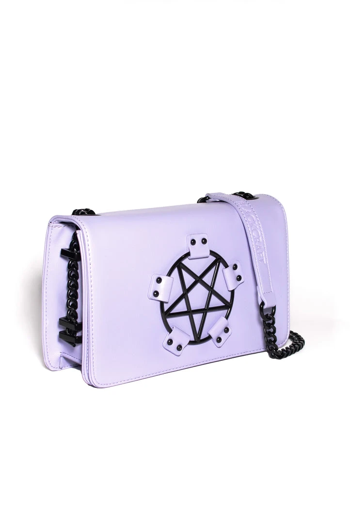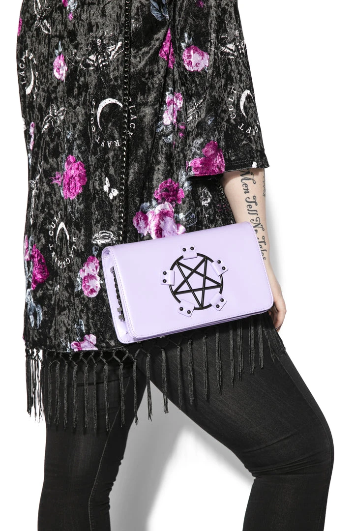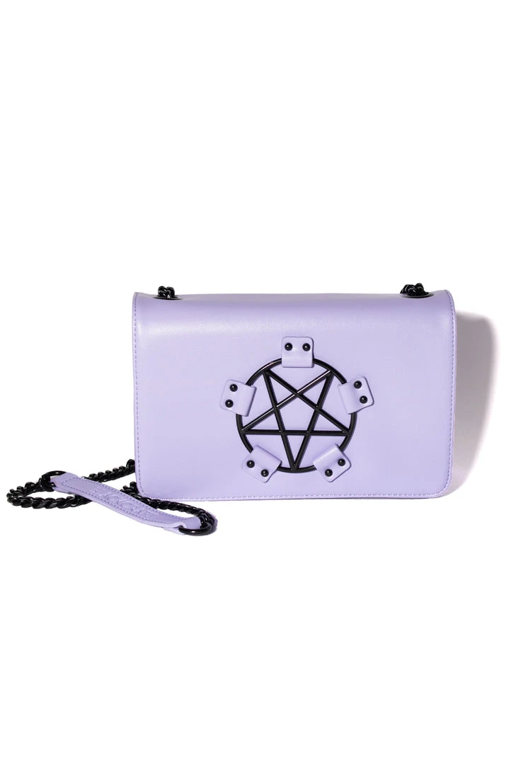 Faux leather crossbody with gunmetal finish pentagram hardware detail.Â