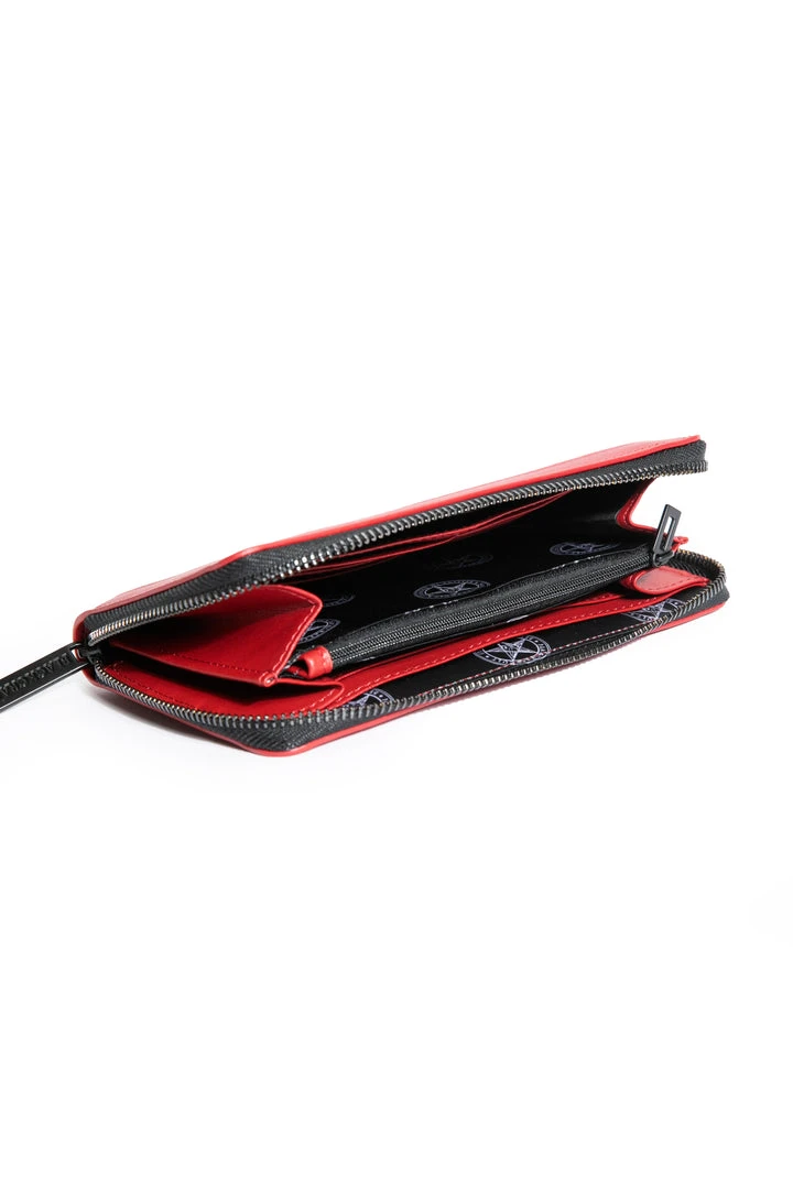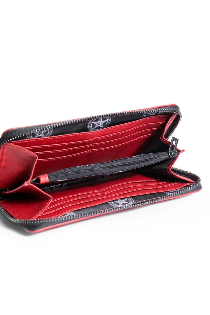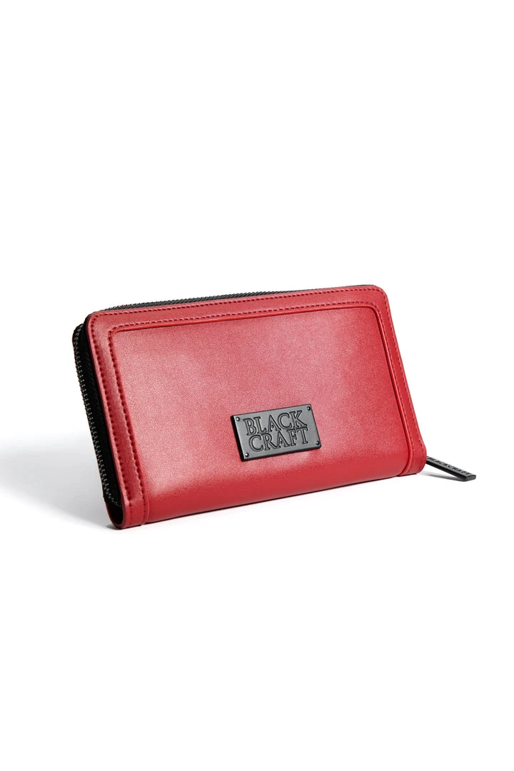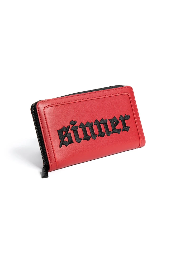 Faux leather zip around wallet with Sinner embroidered on front. Gunmetal finish Blackcraft logo zipper and metal plaque. Features interior zip pocket as well as 12 credit card slots and custom interior lining.