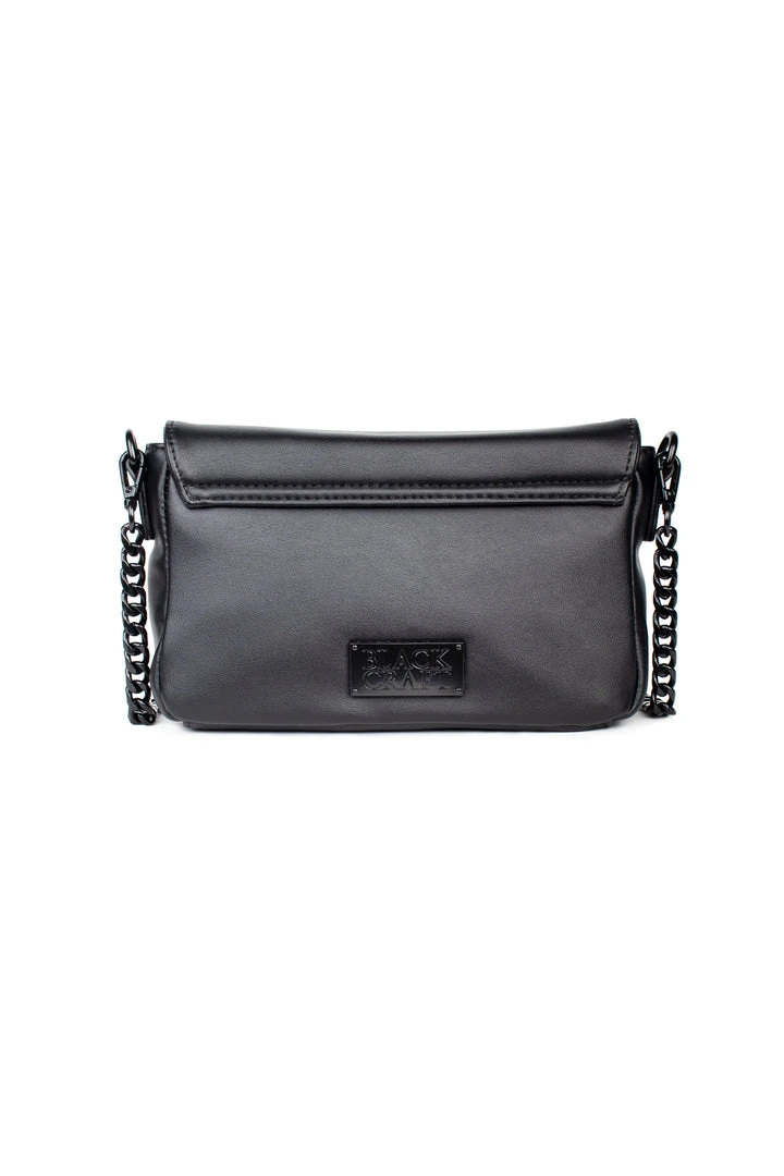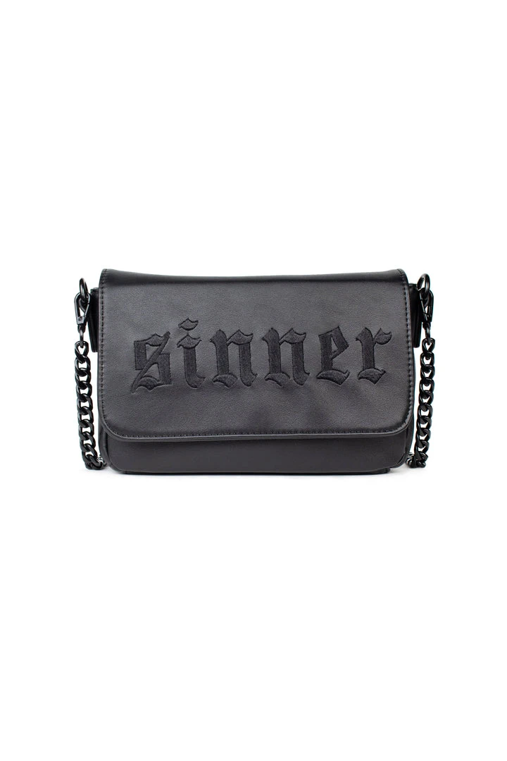 “Sinner” embroidered text on faux leather crossbody with matte black finish hardware and premium quality chain. Removable crossbody strap allows to be carried as a clutch. Custom interior
