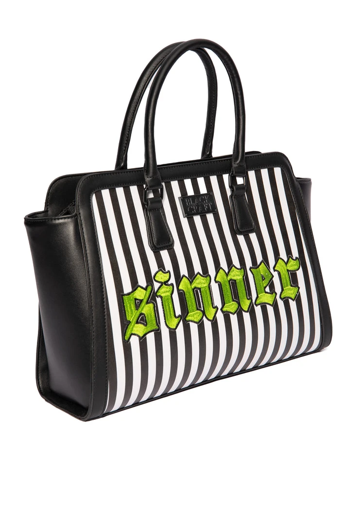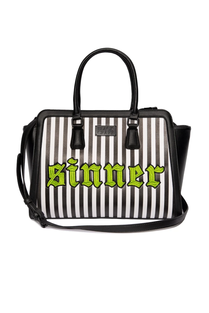 Faux leather large striped satchel with “Sinner” embroidered text. Features zipper pockets on back of bag as well as interior. Includes detachable crossbody strap. Custom interior lining.