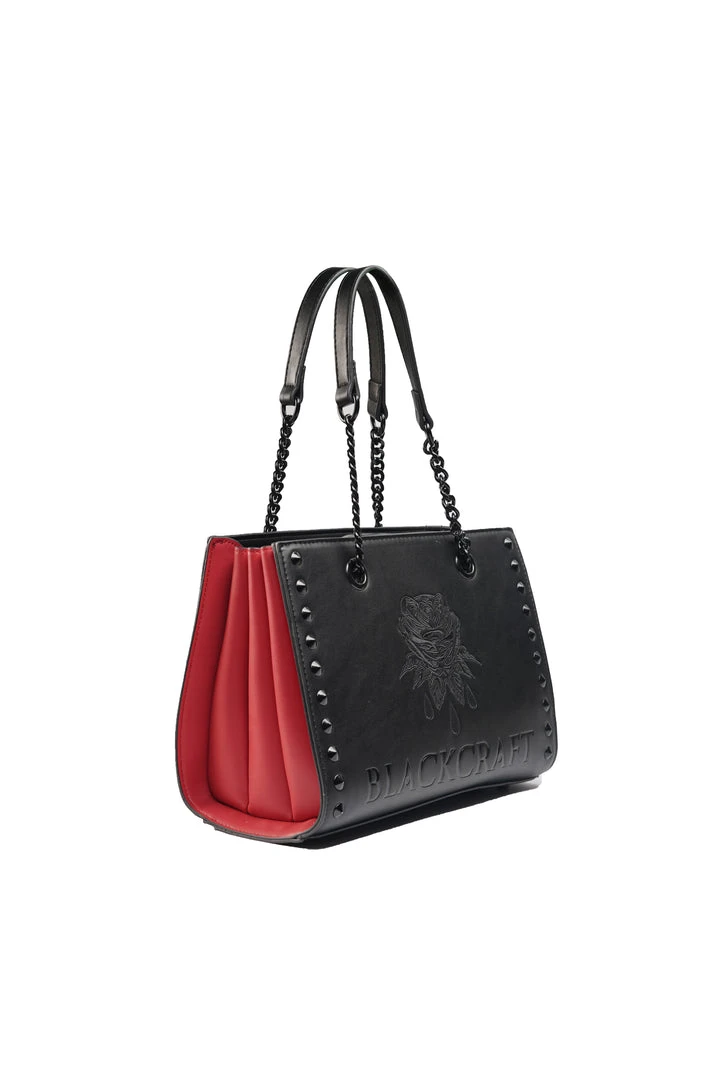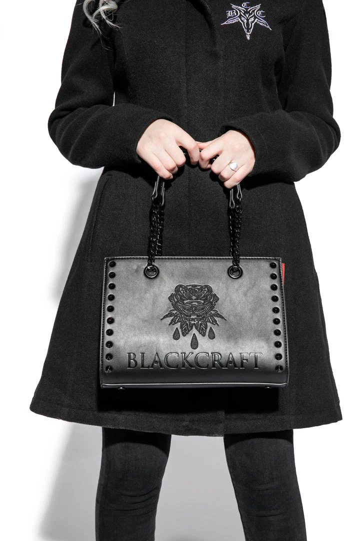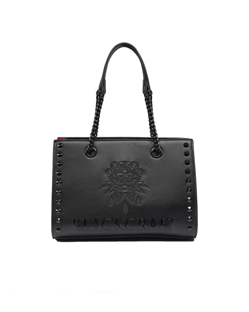 side gussets. Matte black chain and stud hardware. 46″ adjustable removable