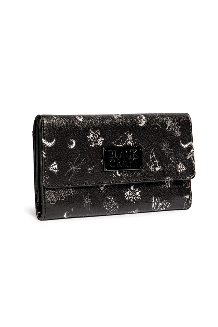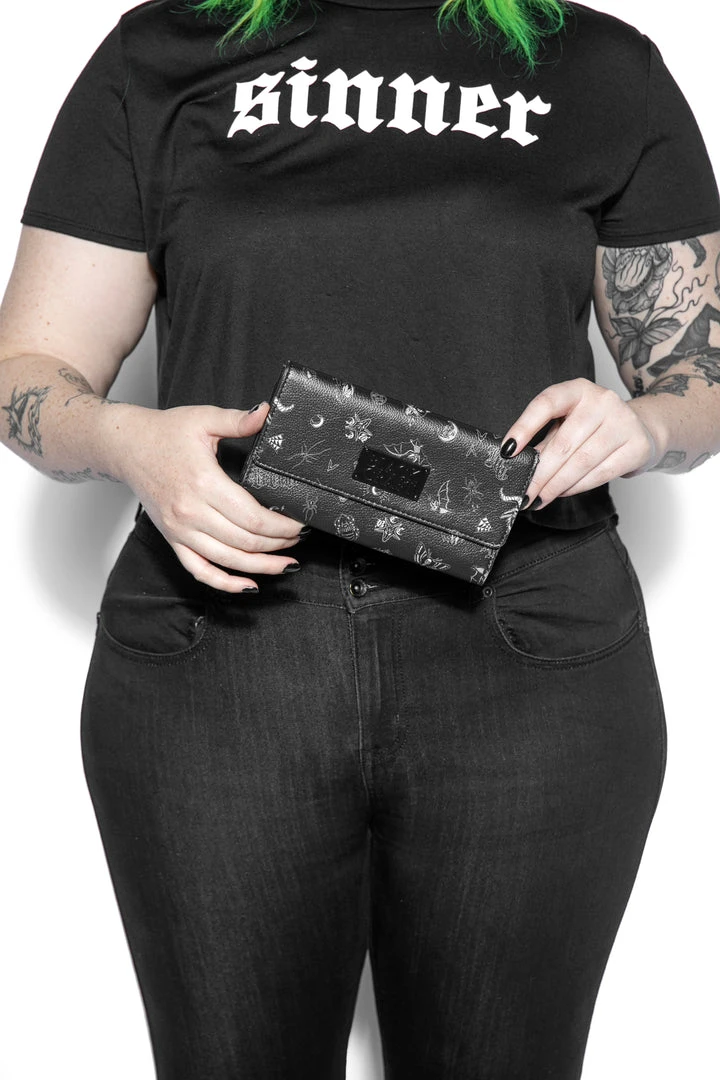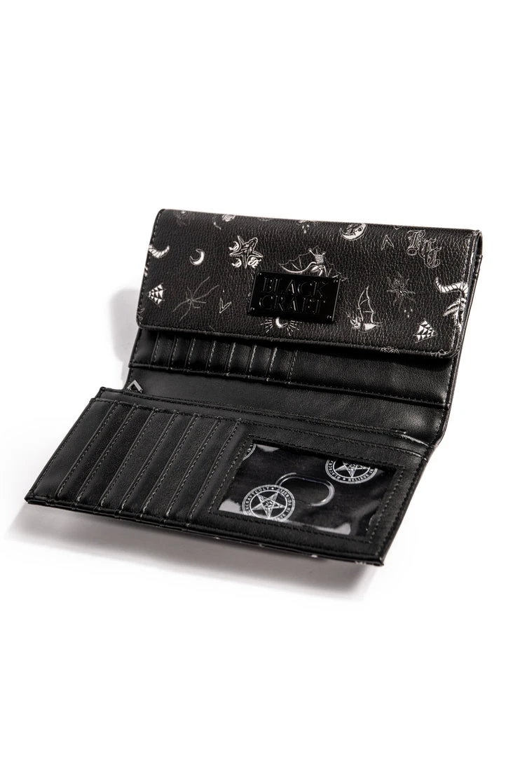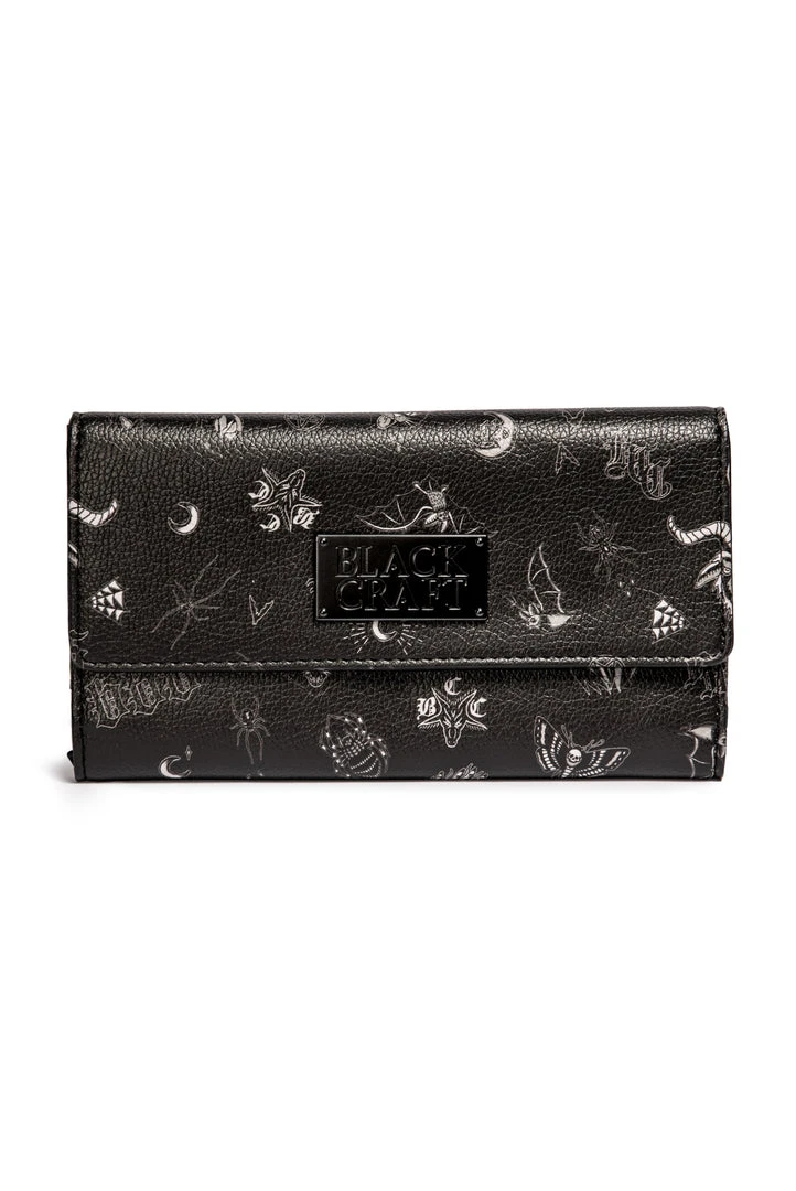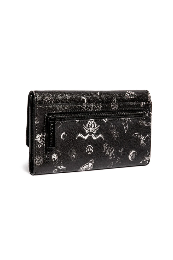 Faux leather slim clutch wallet features all over Tonal Flash print with black logo hardware. Includes 15 credit card slots, interior pockets, and zip pockets.