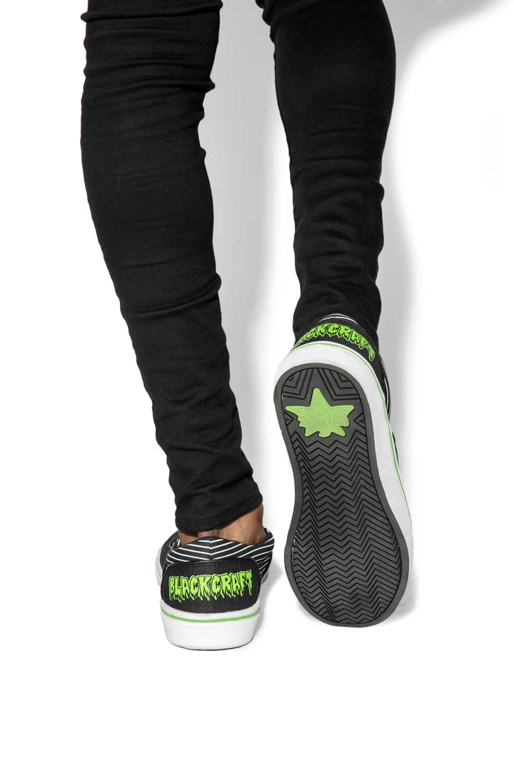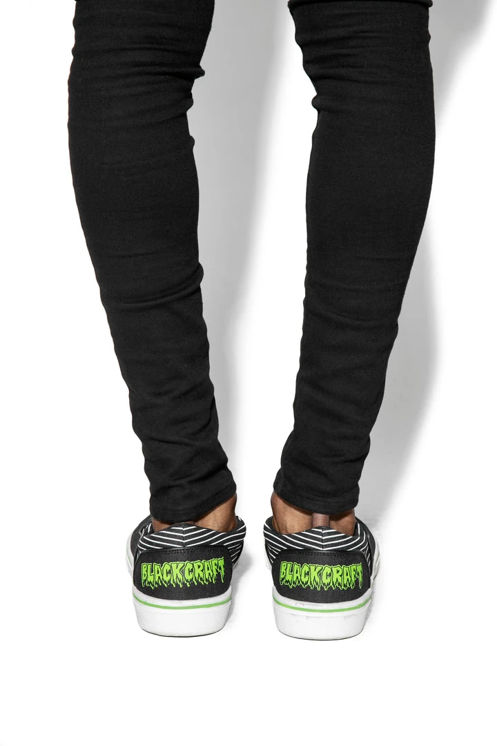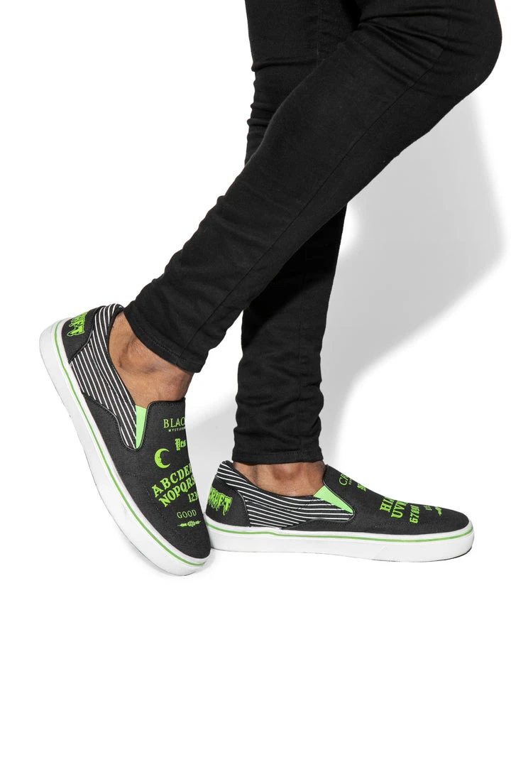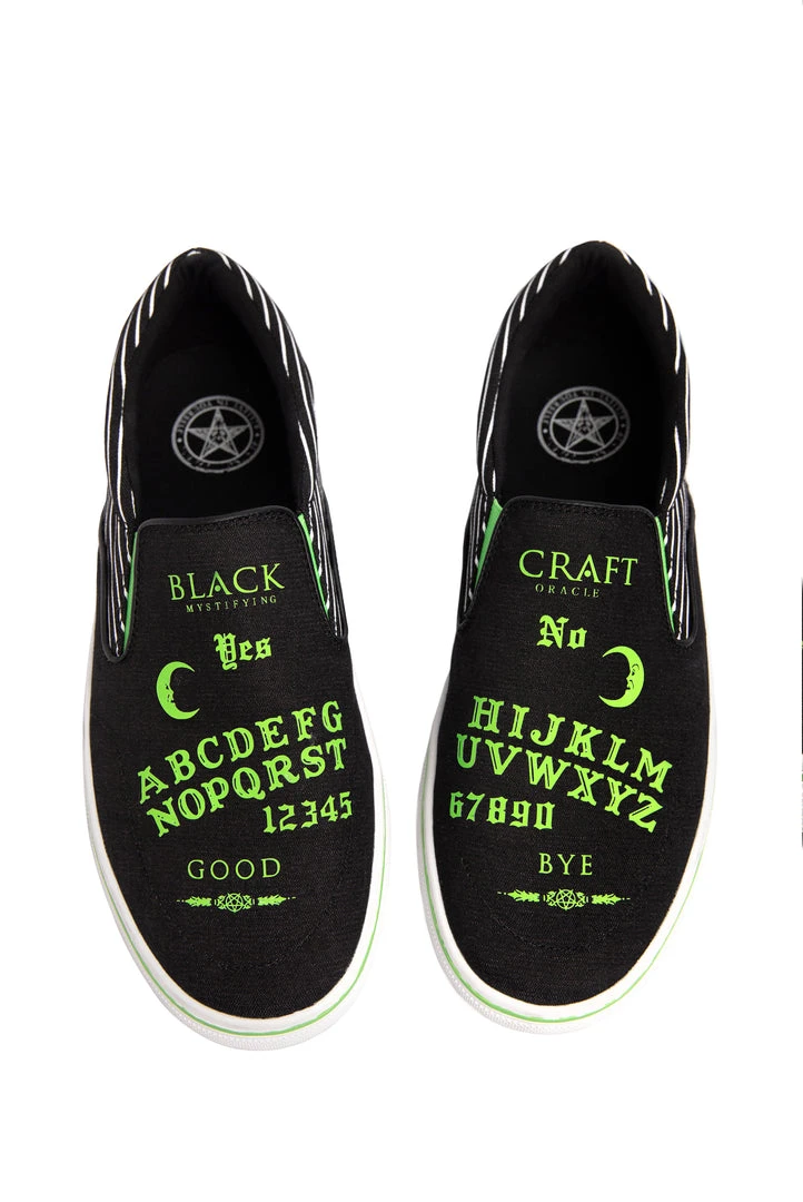 Unisex style slip on sneaker featuring our signature Ouija artwork on black canvas fabric upper and custom Blackcraft logo rubber sole.