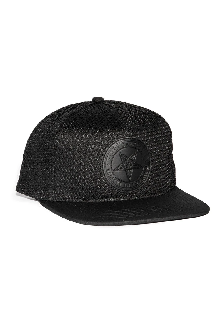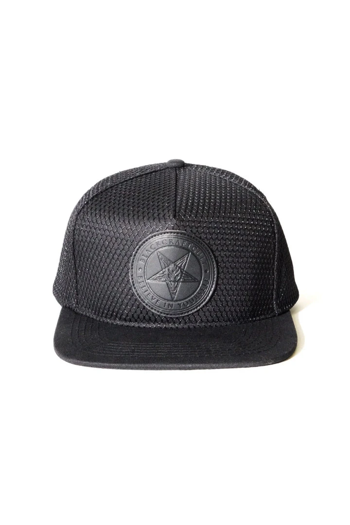 Mesh snapback flat cap with PU leather Believe in Yourself patch.